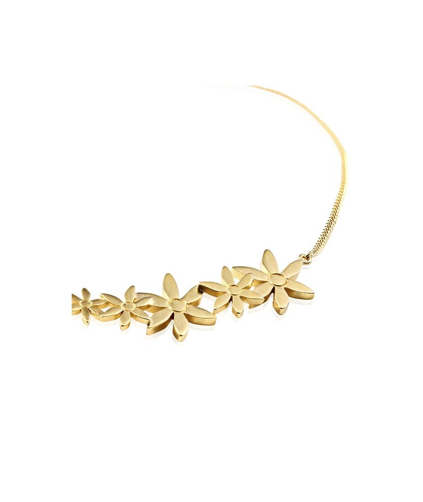 Collaret amb sis flors de safrà irregulars de plata de 925 mm amb bany d'or groc de 18 k. Cadena barbada de plata amb bany d'or i tanca de mosquetó. Inspirat en les formes naturals, és una peça equilibrada que aporta força i elegància. Fet artesanalment a Barcelona. Llargada: 42 cm.