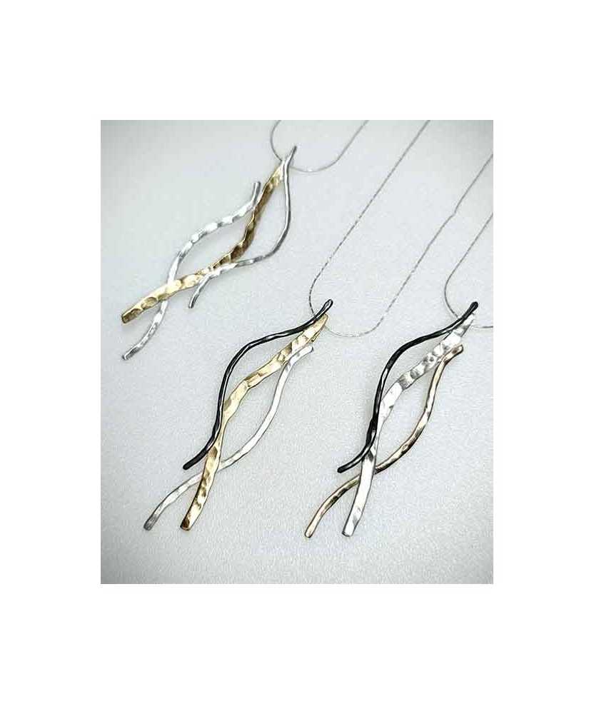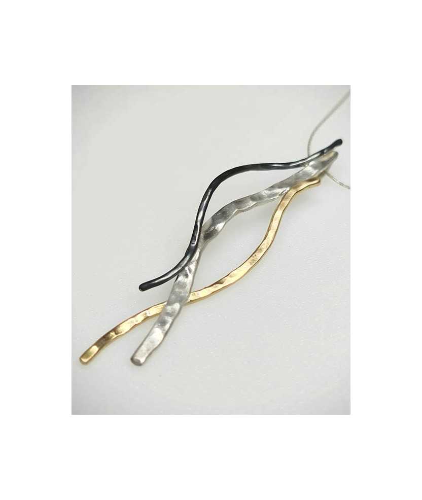 Penjoll PossiDona de plata de llei fet a mà amb tres posidònies i tres acabats diferents: plata, plata ennegrida i bany d'or de 3 µ. La posidònia central és de plata, destacant al conjunt. Disseny allargat amb moviment suau i línies netes. Inclou cadena de plata de llei. Mides: 6 cm de llarg i 1,5 cm d'ample.