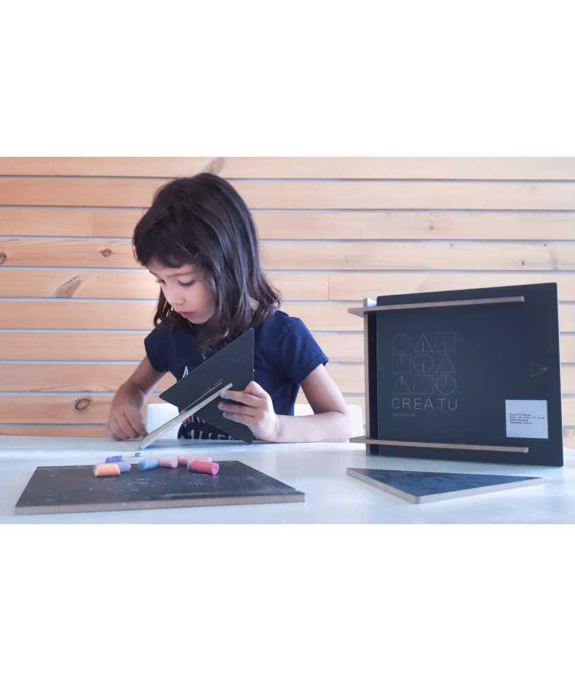 Eina creativa formada per peces de fusta amb encaixos, a partir de la forma tangible de la geometria. Utilitzant les formes geomètriques es pot connectar amb l'entorn i representar tot el que ens envolta observant les seves propietats, les seves funcions estructurals, les seves virtuts i interpretant allò que ja està creat, experimentant directament amb la seva essència formal. Les peces estan acabades amb pintura de pissarra per poder-hi dibuixar, pintar i escriure. Disponible amb caixa del mateix material o sense.