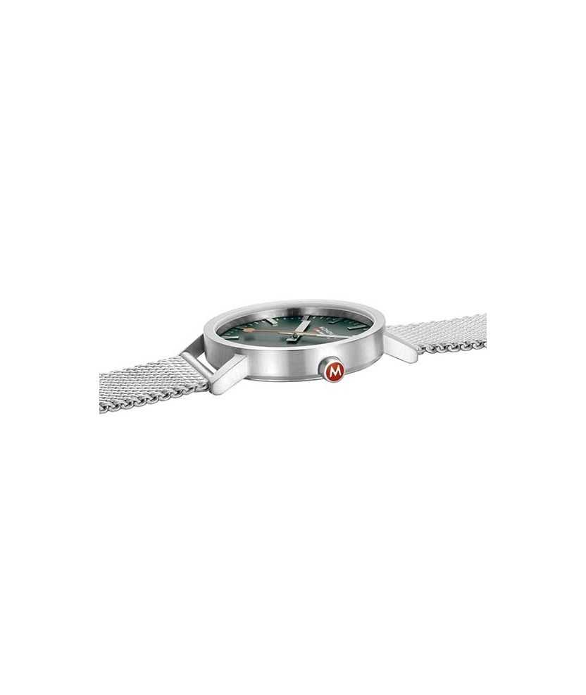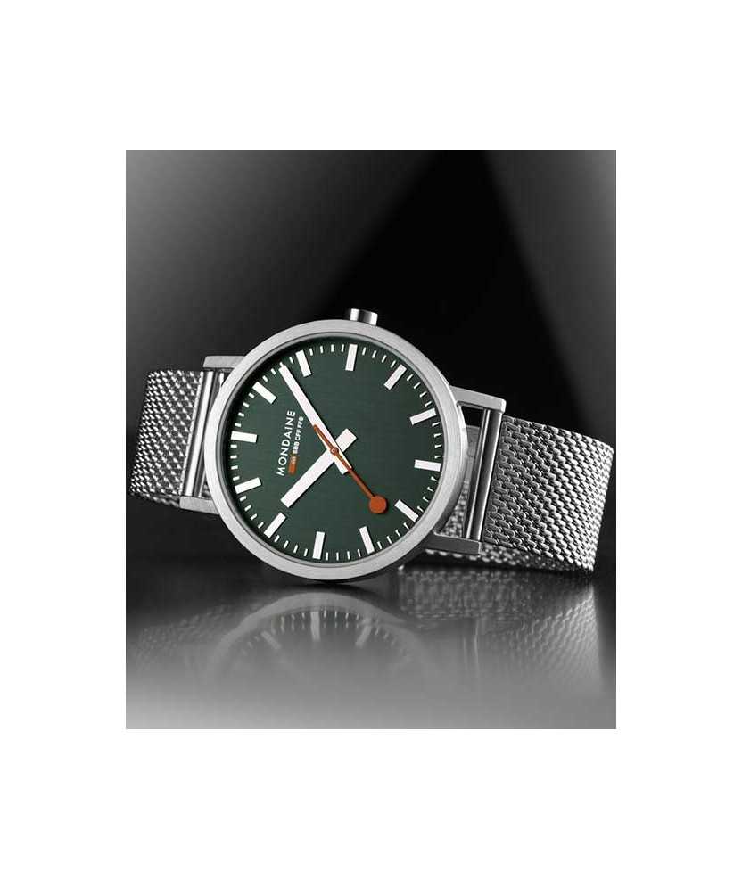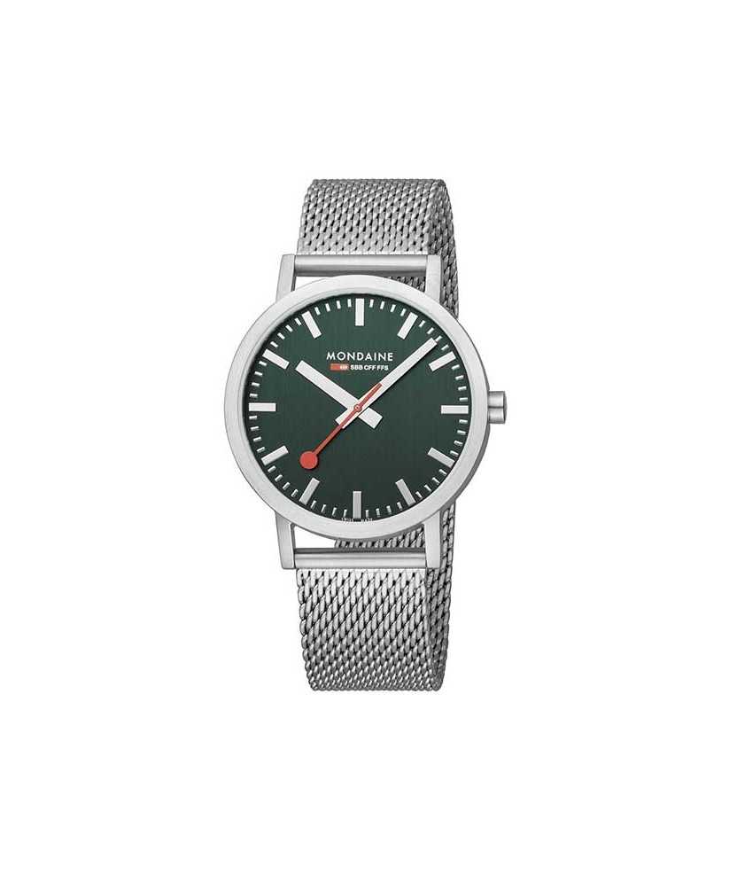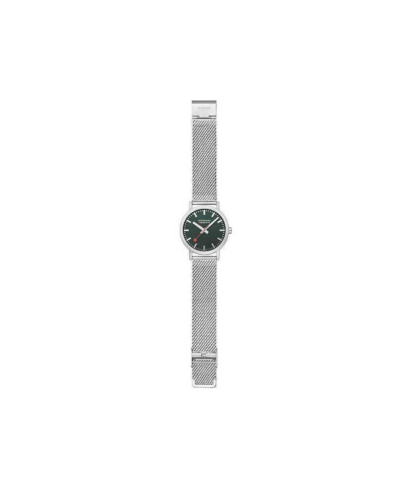 El rellotge suís Mondaine SBB Classic és un dels veritables clàssics del disseny reconeguts a tot el món. La forma senzilla, la caixa d'acer mat de 40 mm de diàmetre, el vidre de mineral endurit, braçalet malla milanesa i esfera de color verd fosc fan d'aquest rellotge una veritable icona del temps. Moviment de quars amb mecanisme Ronda 513. Resistència a l'aigua de 3ATM/30 m.