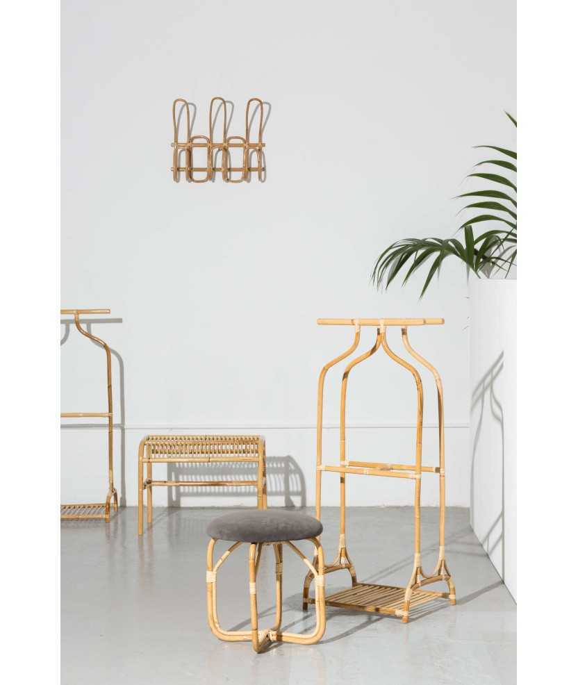 Miguel Milá, després d'observar que en un hotel normalment ens sobra espai a l'armari i que ens falten més elements pràctics, va dissenyar la col·lecció Room, formada per un galant de nit individual i un de doble, un penjador de paret, un tamboret i una banqueta per a maletes. Tots ells de rotang natural, segueixen amb la línia del seu autor de posar el dia la tradició i d'aconseguir el luxe a través del confort. De rotang natural. Mides: 45x40 cm.