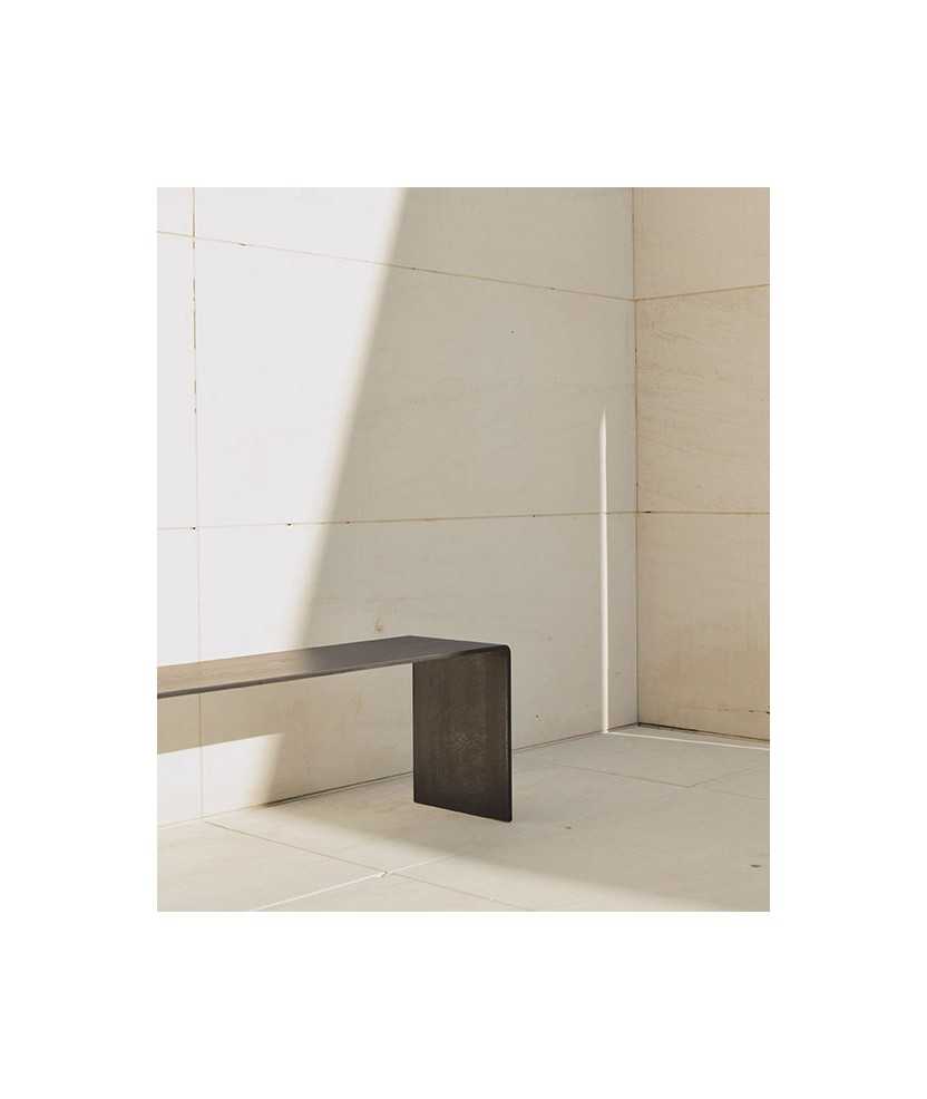 Una línia continua plegada en una proporció equilibrada són les taules MM, sense talls, sense peces, sense parts. Sense pretensions, es mostra el material, l'acer negre, en el seu estat original, tractat amb l'objectiu de subratllar-ne la bellesa evident. Es tracta d'un moble versàtil: una taula auxiliar, un banc... amb una proporció poc treballada al mobiliari més convencional malgrat la seva evident harmonia. El disseny lleuger, de només 1 cm de secció, contrasta amb la robustesa real del moble. Mides: 130x40x40 cm.