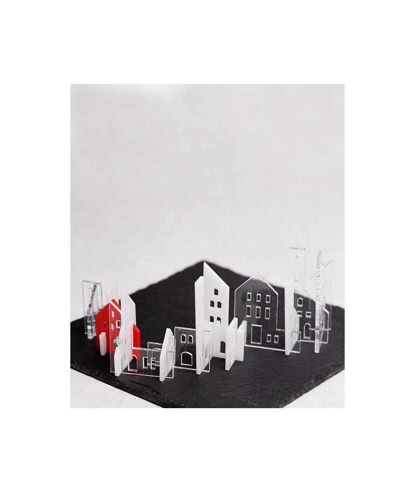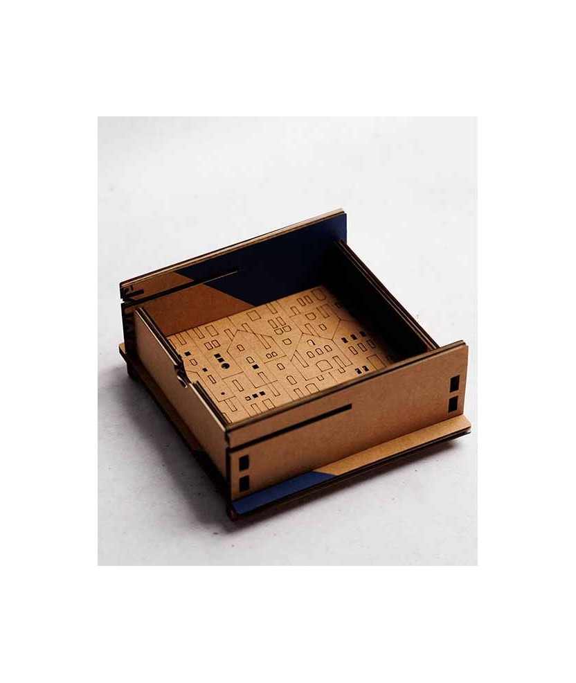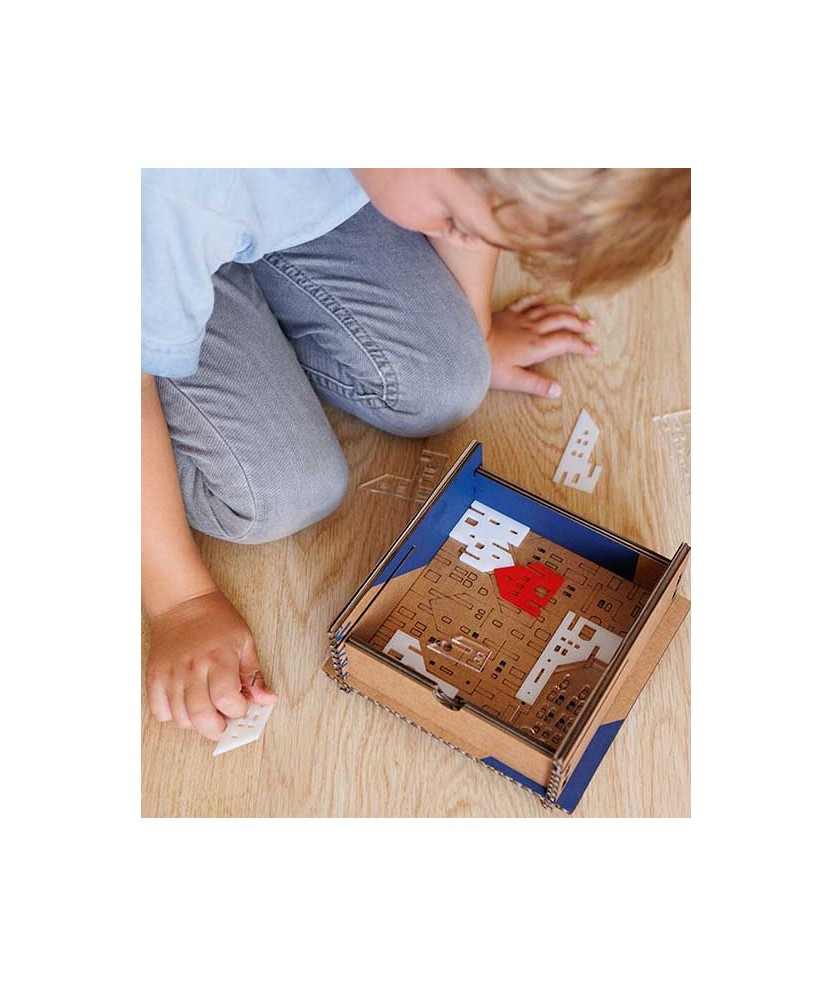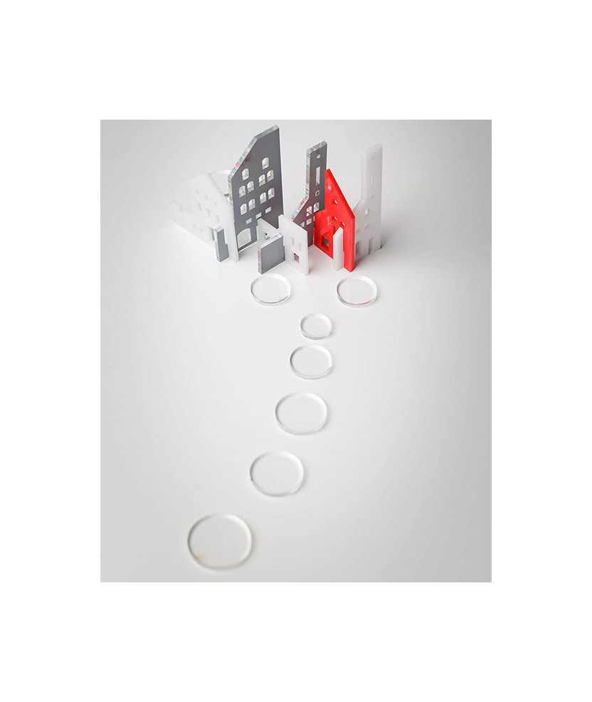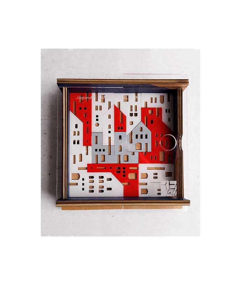 Trencaclosques creatiu format per peces de metacrilat REscatat* de diferents colors en funció del rebuig industrial. Consta de 16 peces que es poden col·locar dins la capsa seguint el dibuix gravat a la base i també es poden encaixar entre elles fora de la capsa per crear diferents ciutats imaginàries. Ideal per impulsar la creativitat de petits i grans. *Rescatat: Reaprofitament de peces sobrants de l'activitat de tallers de retolació i arts gràfiques. Mides de la capsa: 18x17x8 cm, Exterior 14,5x14,5 cm Interior.