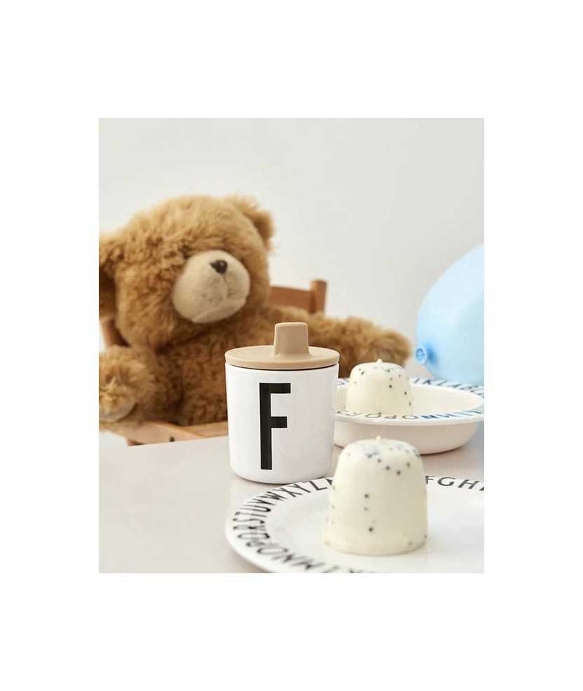Got de color blanc amb una lletra de l'abecedari en negre amb la tipografia d' Arne Jacobsen. Resistent i respectuós amb el medi ambient, està fet d' Ecozen, un material orgànic no tòxic, 100% lliure de BPA i BPS, que prové del blat de moro. És apte per al rentavaixelles i microones (màx. 80 C). Més lletres disponibles. Mides: 7,3x7,5 cm.