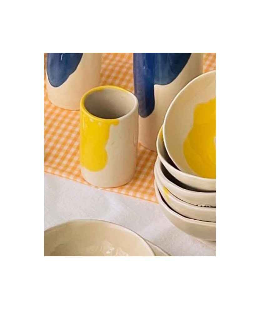 El Set de gots Pareidolia està format per peces de gres pintades a mà amb engalba de color groc, amb un acabat brillant sense plom. El seu procés de fabricació inclou un bescuit i una cocció que garanteixen la seva durabilitat. A més, és un producte no tòxic, apta per a l'ús alimentari, i es pot rentar al rentaplats i utilitzar al microones. Cada peça és única, ja que es fa de manera artesanal. Inclou 2 gots. Mida: 7x9 cm.