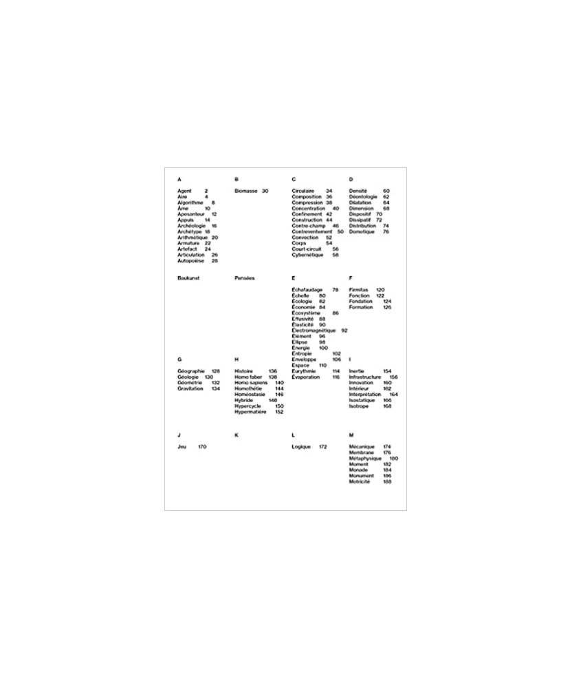 A construction of collisions of ideas, assemblages of thoughts, which bring out new images, silences, certainties, doubts, worlds and which give us a m of thinking and composing, this publication is the result of the long work carried out par the Belgian agency BAUKUNST. The work consists of deliberately fragmentary parts assembled in a triptych form including Words, Definitions and Quotations.