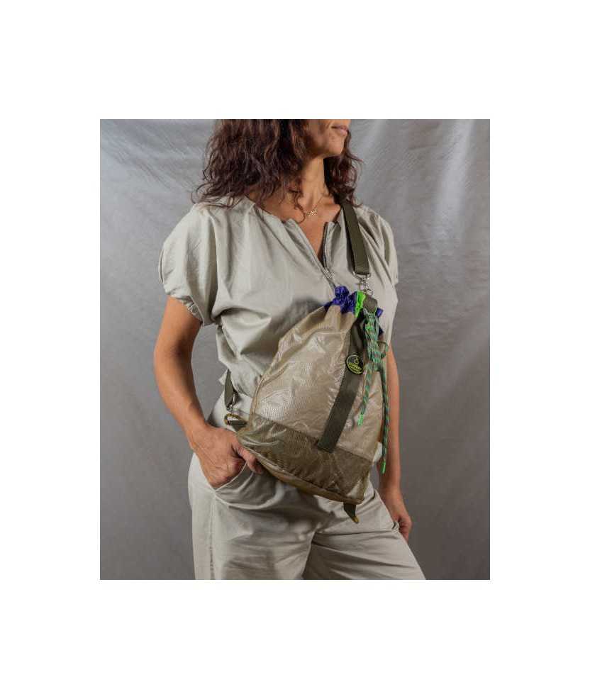 Mochila convertible en bandolera diseñada por Pucker, pensada para llevar lo esencial con comodidad. Ofrece cuatro posiciones de uso gracias a su correa regulable con mosquetones y está confeccionada en nylon ripstop de paracaídas con detalles funcionales. Medidas: 39 x 31 cm.