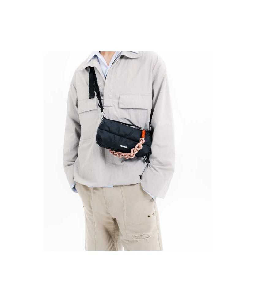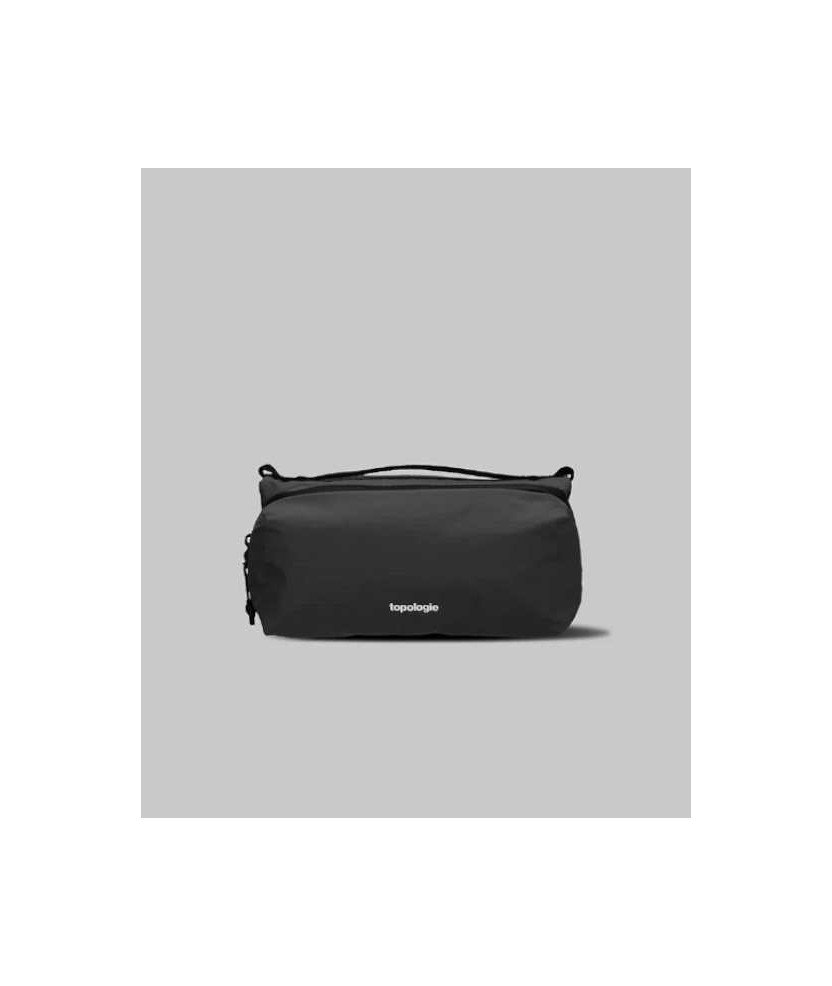 Bolso Bottle Sacoche Papery Black de Topologie en nylon reciclado repelente al agua, diseñado para llevar botellas de 500-1000 ml y tus esenciales diarios con un look urbano y funcional. Con compartimentos con cremallera y bolsillos internos para organizar pequeños objetos. Medidas: 23 x 10 x 10,5 cm · Capacidad: 1,3 l. Correa no incluida.