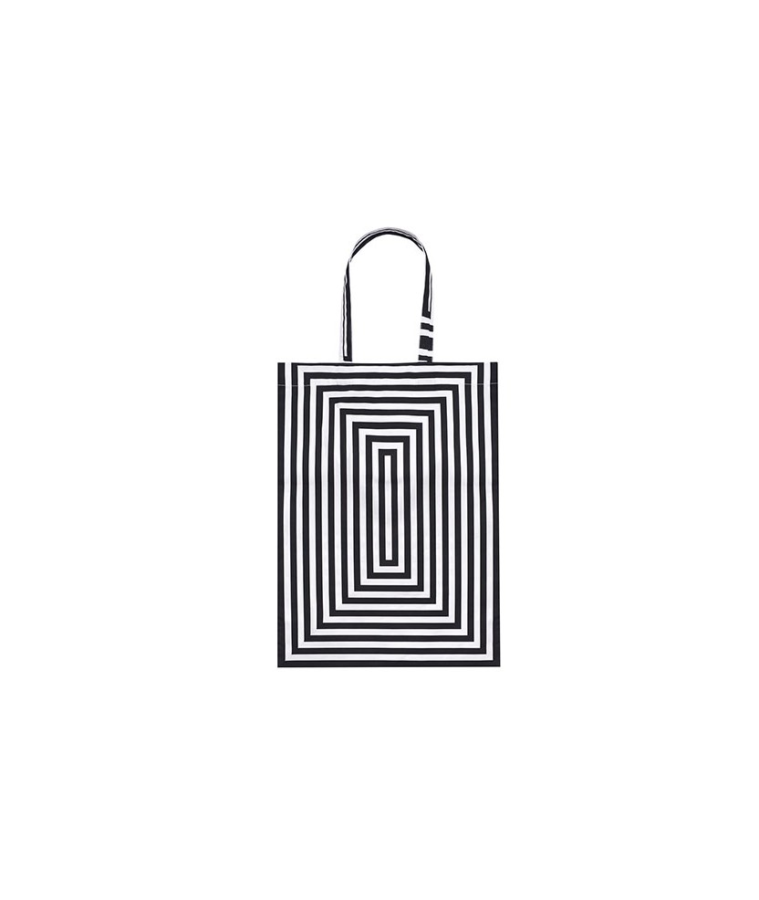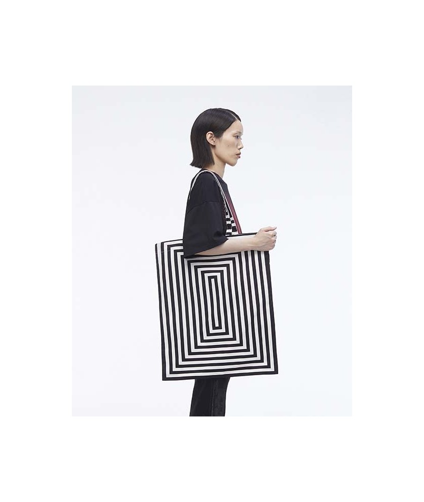 Bolsa de algodón sarga de 260 g/m² diseñada por Dunja Jankovic dentro de The Bag Project. Estampada con tintas de base de agua mediante serigrafía, presenta un patrón de líneas propio de su obra visual. Adecuada para el uso diario por su capacidad y resistencia. Se puede lavar hasta 30 °C. Medidas: cuerpo 55x45 cm, bolsillo interior 29x23 cm, asas 60x3 cm.