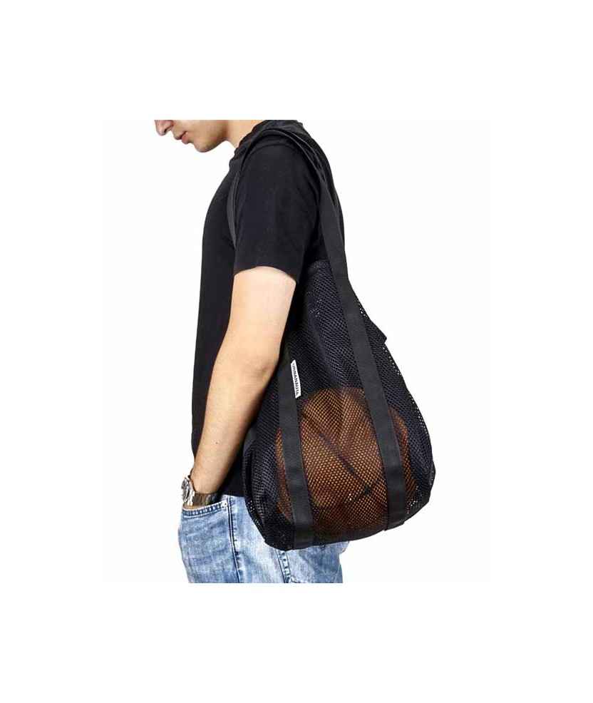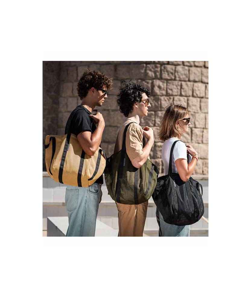 Bolso todo terreno confeccionado por Ared, una empresa de inserción en la que crean oportunidades laborales para mujeres y hombres en riesgo de exclusión. Está hecho de rejilla de poliéster reciclado resistente y dispone de dos botones para cerrarlo, tanto si lo llevas cogido por las asas cortas como colgado en el hombro. Dispone de bolsillo interior cerrado con cremallera. Disponible en dos medidas y varios colores. Hecho en Barcelona. Medidas: 30x30x35 cm.