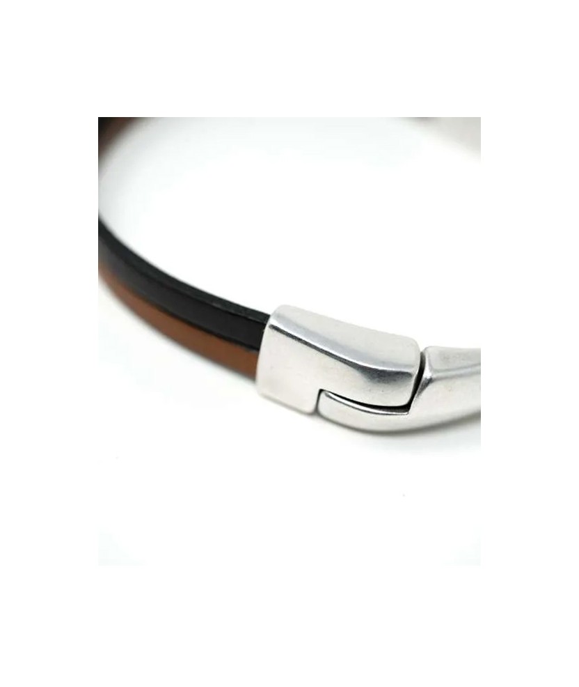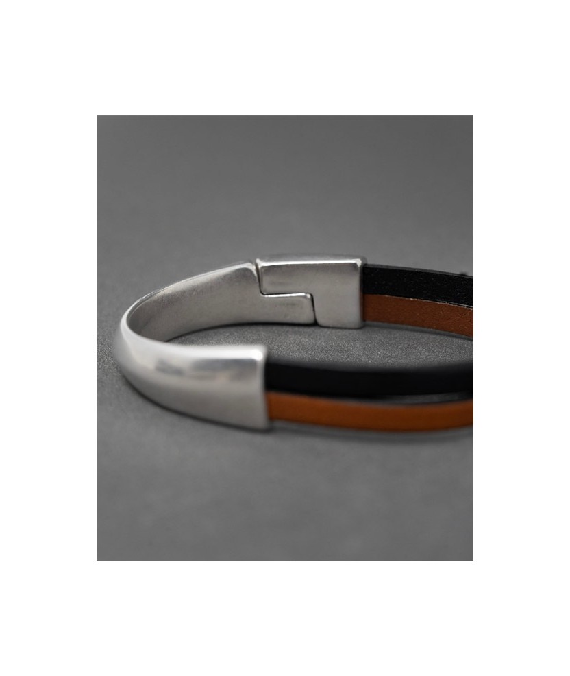 Pulsera Alexis con doble tira de piel adherida a una pieza semi-rígida de zamak bañada en plata u oro viejo, con cierre de imán incorporado en la misma pieza. Hecha a mano con cuidado, disponible en negro o marrón. Diseño moderno y diferente, adaptable a la medida de la muñeca.