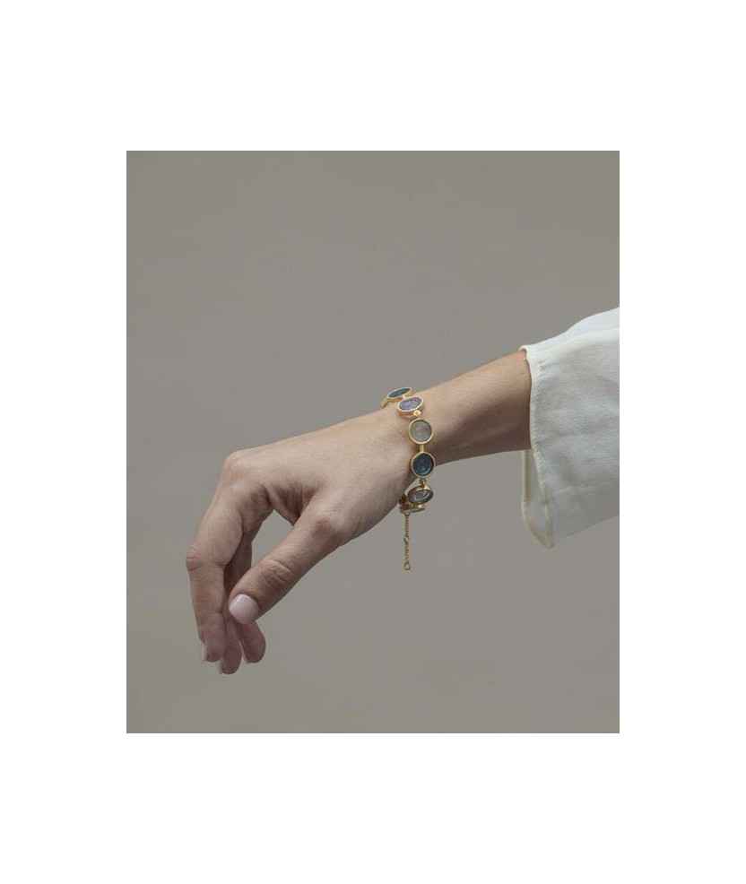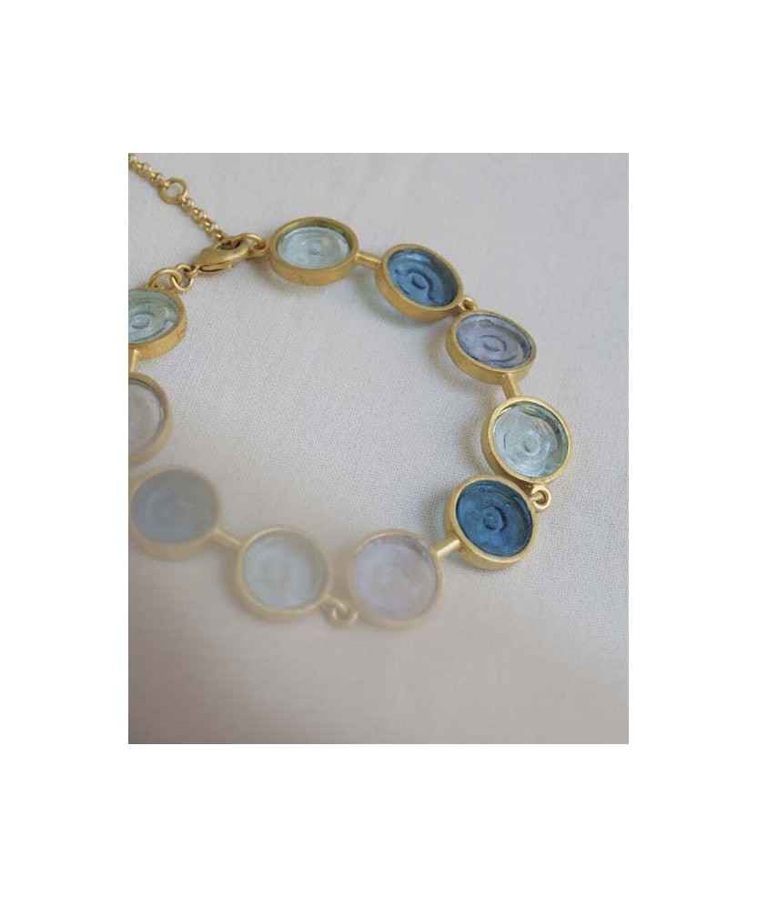 Pulsera de latón mate dorado con baño de oro de 24 K, formado por varios círculos de vitral de Murano artesanales, de diferentes tonalidades de color azul. Diseño inspirado en la cristalera de la Casa Batlló, obra del arquitecto Antoni Gaudí. Gaudí Jewelry es una colección de joyería que sintetiza la obra del referente del Modernismo es un regalo. Medidas: 16x1,20 cm.