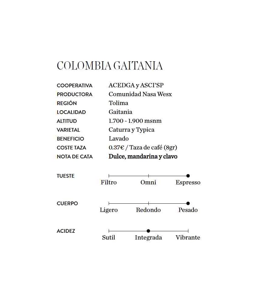 La Comunidad Gaitania (Tolima) produce café orgánico de alta calidad gracias al trabajo de la comunidad indígena Nasa Wesx y sus cooperativas locales. Su proceso incluye recolección selectiva, fermentación de 24 h y secado cuidadoso. Cafés El Magnífico, tostadora de Barcelona reconocida por su tradición, trazabilidad y excelencia en cafés de origen, es quien nos hace llegar esta variedad. 250gr.