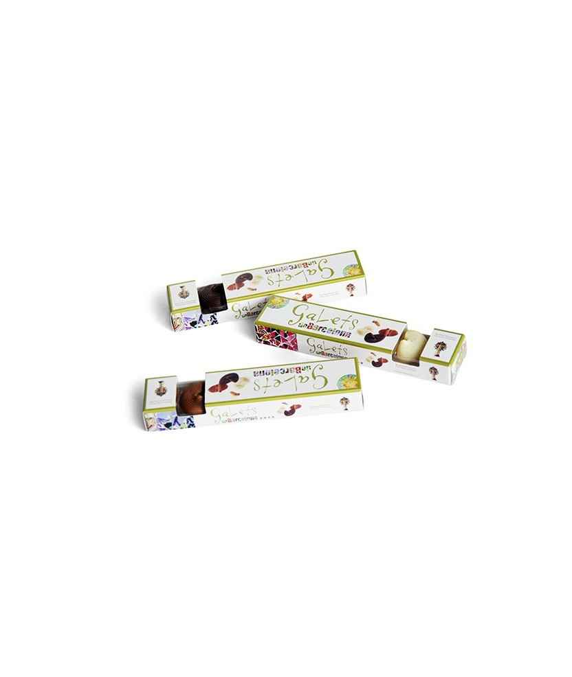 Estuche con 7 bombones de chocolate con forma de galet, rellenos de fantasía creativa de Barcelona. Esta famosa pasta tiene sus orígenes en la Barcelona de principios de siglo XX, cuando un fideuero de Valls que se había establecido en Barcelona y su esposa, del barrio del Born, crearon para celebrar la Navidad lo que hoy es reconocido como un símbolo de la gastronomía y de la sociedad catalana. Disponibles en chocolate blanco, chocolate con leche y chocolate negro. Medidas: 21,5x5x3 cm.