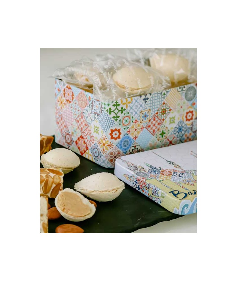 Turrón de almendra de 100 g, envasado individualmente en lata de metal. Presenta una combinación de colores variados, con predominio del azul, que le da un aspecto atractivo y distintivo. Cada pieza está pensada para conservar la frescura y sabor de las almendras y del turrón tradicional, ofreciendo una experiencia dulce y artesanal. Peso total con envase: 235 g. Medidas: 154 x 94 x 62 mm.