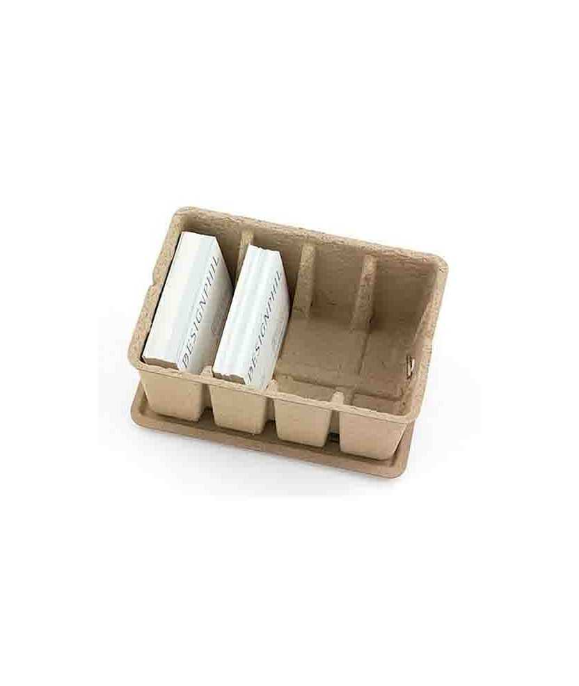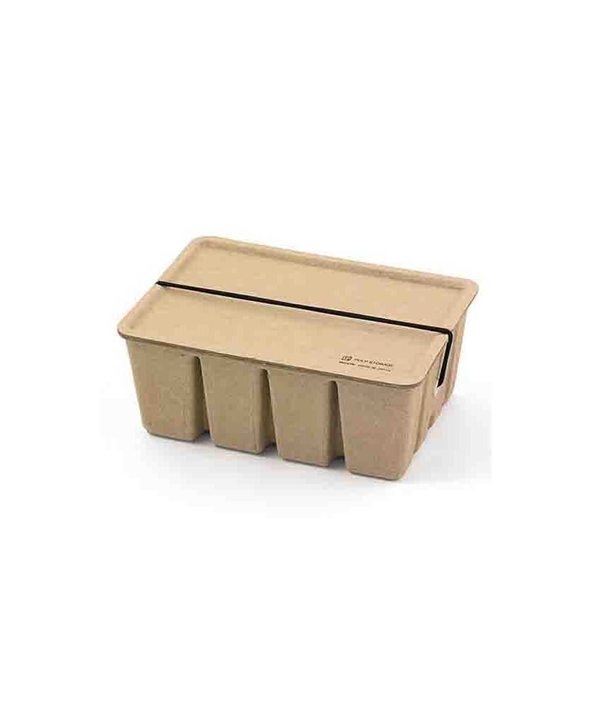 Pulp Storage es un producto de almacenamiento diseñado para ser respetuoso con el medio ambiente, fabricado con materiales 100% reciclados, resistentes al agua y equipados con gomas que aseguran un cierre hermético y permiten apilar las cajas con facilidad. Medidas: 16,7 x 11,9 x 6,8 cm.