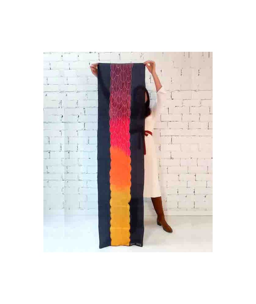 Pañuelo que pertenece a la colección 'Alta Artesanía', de seda 100% natural del tipo ponge 08 y de medidas 180x45cm pintado a mano con la técnica de la guta. Es un producto artesano de creación sostenible hecho con seda de primera calidad y con una vida útil muy larga. Consta del Distintivo de Artesanía otorgado por CCAM y la Generalitat de Cataluña. Son una serie limitada de 20 unidades con certificado de autenticidad de cada pieza y firma de la artista.