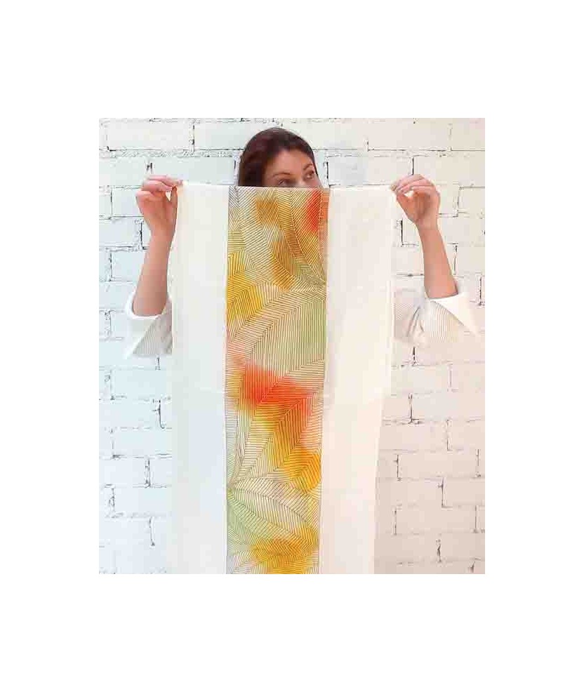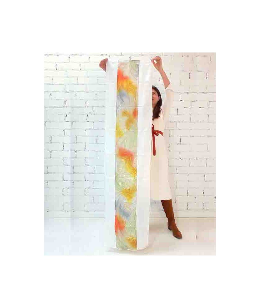 Pañuelo que pertenece a la colección 'Alta Artesanía', de seda 100% natural del tipo ponge 08 y de medidas 180x45cm pintado a mano con la técnica de la guta. Es un producto artesano de creación sostenible hecho con seda de primera calidad y con una vida útil muy larga. Consta del Distintivo de Artesanía otorgado por CCAM y la Generalitat de Cataluña. Son una serie limitada de 20 unidades con certificado de autenticidad de cada pieza y firma de la artista.