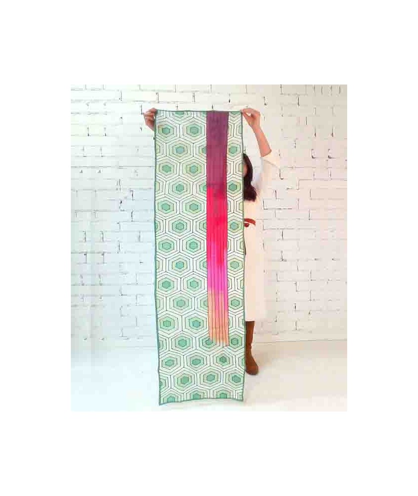 Pañuelo que pertenece a la colección 'Alta Artesanía', de seda 100% natural del tipo ponge 08 y de medidas 180x45cm pintado a mano con la técnica de la guta. Es un producto artesano de creación sostenible hecho con seda de primera calidad y con una vida útil muy larga. Consta del Distintivo de Artesanía otorgado por CCAM y la Generalitat de Cataluña. Son una serie limitada de 20 unidades con certificado de autenticidad de cada pieza y firma de la artista.