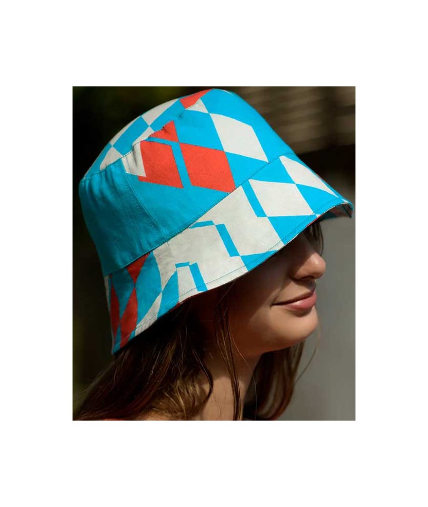 Sombrero de pescador de algodón con estampado de Kristina Nordlöf en tonos turquesa, beige y frambuesa. Presenta un ala mediana sin acolchado y con pespunte, y un forro interior de algodón crudo procedente de tejidos sobrantes. El diseño es plegable para facilitar su transporte y almacenamiento.