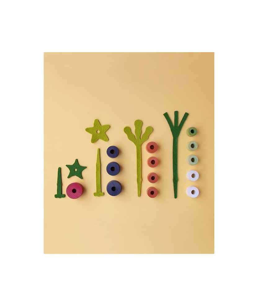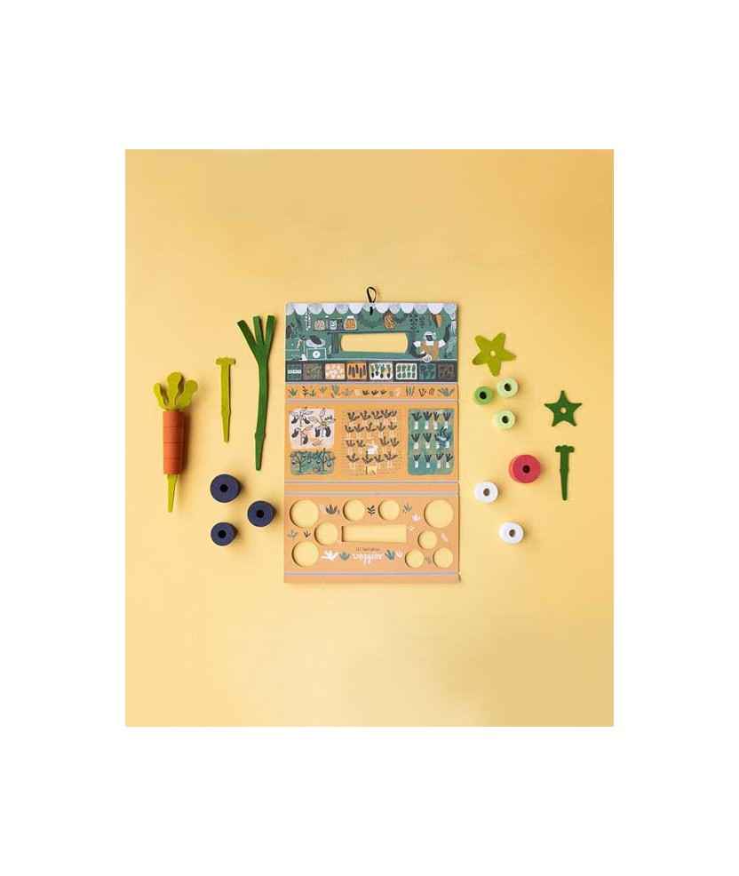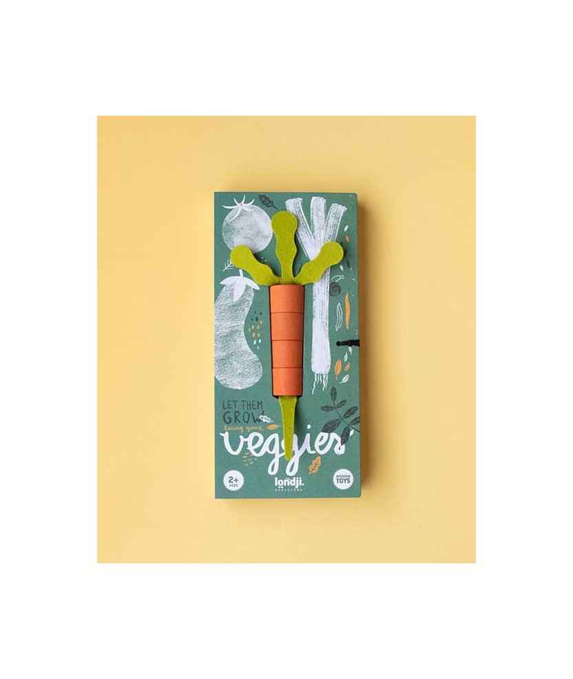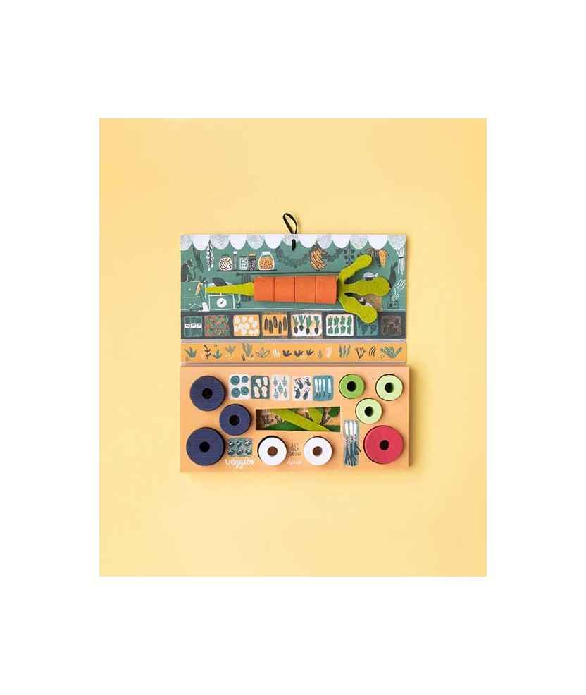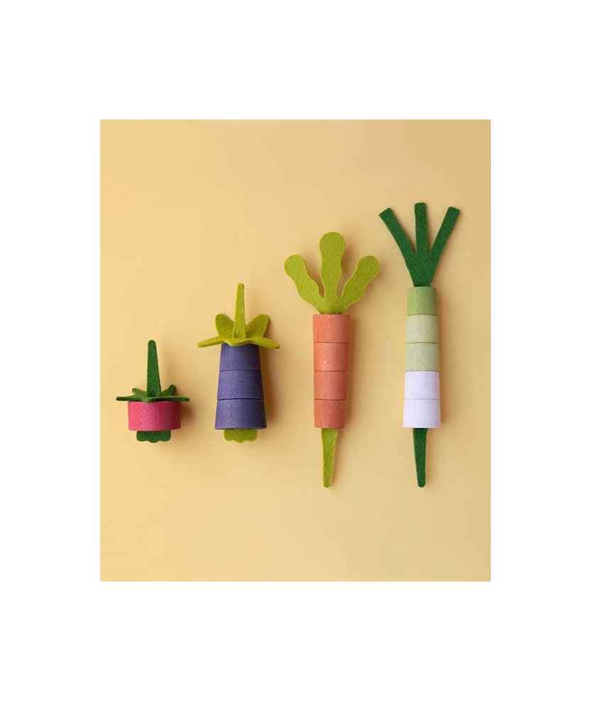 Al abrir el juego encontrarás 13 piezas de madera de haya y 6 piezas de fieltro de lana. El juego consiste en formar cuatro verduras ordenadas de menor a mayor dificultad. Para conseguirlo, primero tendrás que elegir las piezas de la hortaliza que quieras montar, respetando el orden y el color. Hecho en Barcelona. Edad: +2 años.