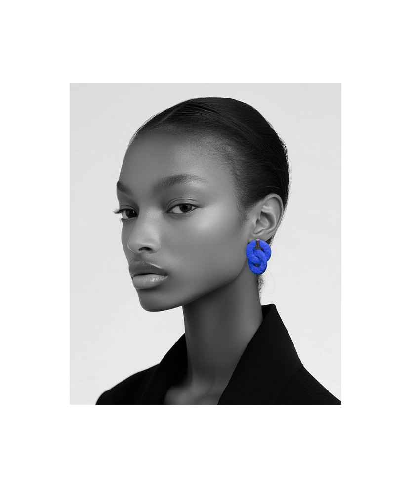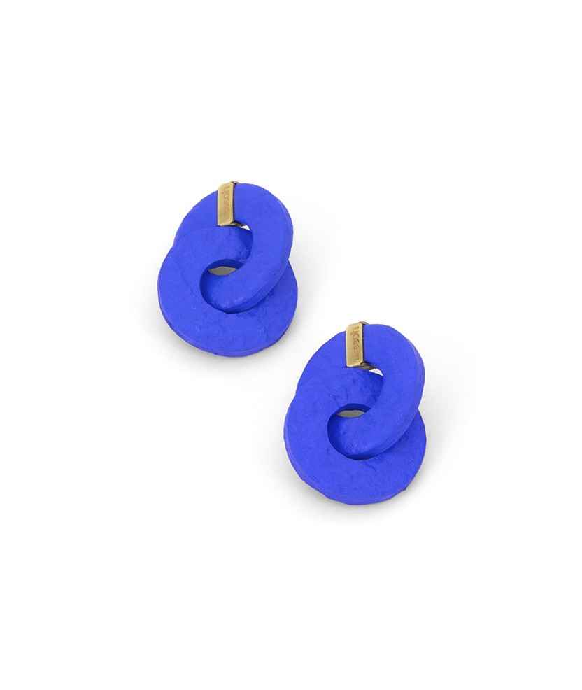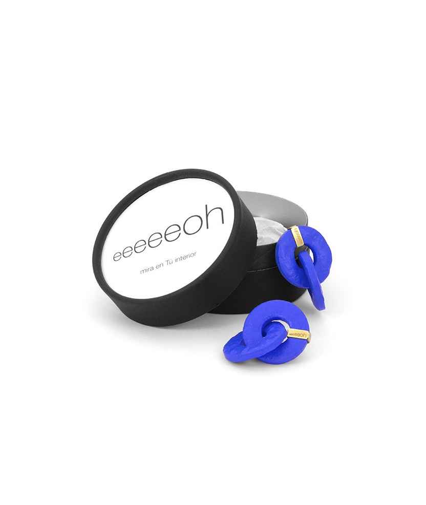 Modelo 11, pendiente de forma circular, tamaño pequeño y color azul. Eeeeeoh es más que un pendiente: es un código de inclusión elaborado con material reciclado y ecológico, creado por personas con diversidad funcional en LaFact. Inspirado en la geometría de la Bauhaus y la filosofía Gestalt, esta pieza ligera de menos de 3 g conecta con la belleza interior y el equilibrio personal. Incorpora cierre hipoalergénico para garantizar comodidad y seguridad.