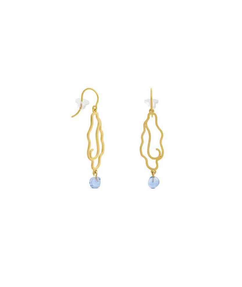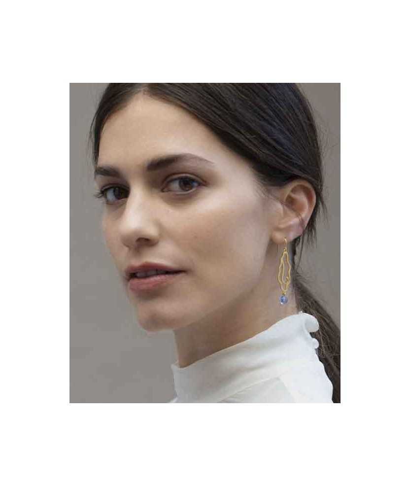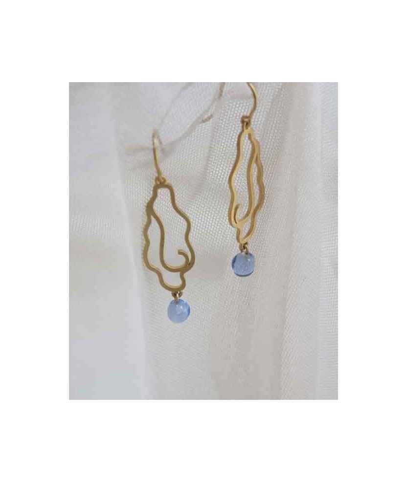 Pendientes de latón mate dorado con baño de oro de 24 K y bola en movimiento de color azul de cristal de Murano artesano. Diseño inspirado en las formas naturales que hay dentro de La Pedrera, obra modernista, del año 1906-1910, del arquitecto Antoni Gaudí. Gaudí Jewelry es una colección de joyería que sintetiza la obra del referente del Modernismo es un regalo. Medidas: 4,30x1,30 cm.