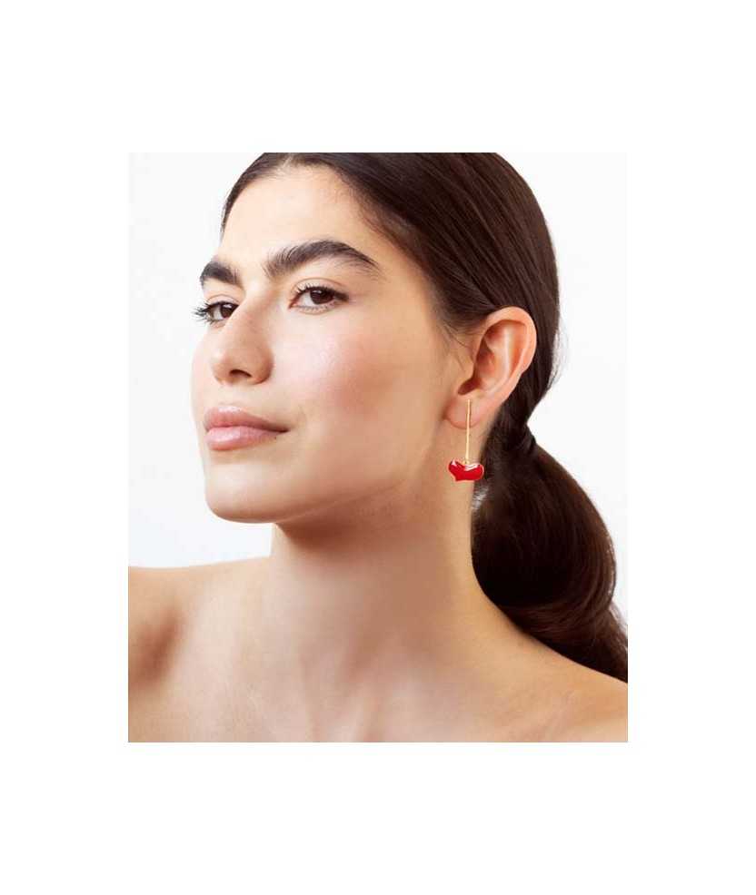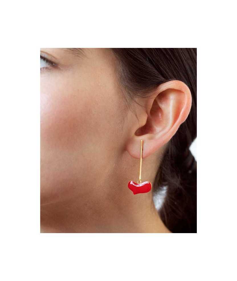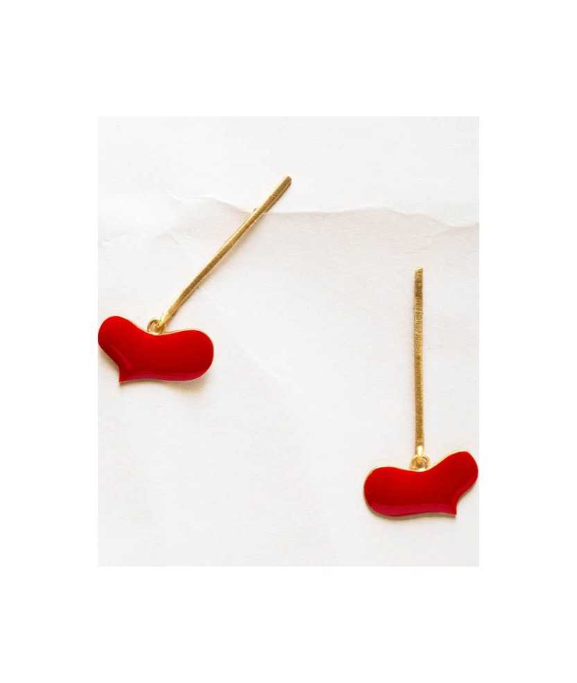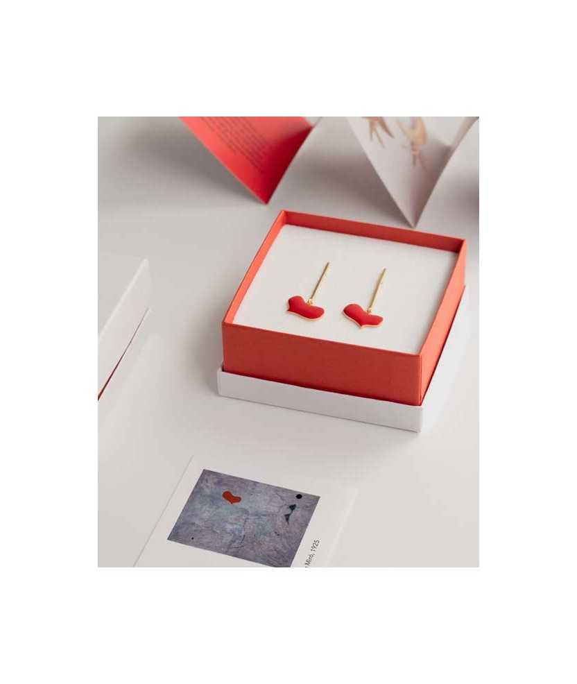 Pendientes dorados con corazón colgante esmaltado en color rojo. Pieza inspirada en la obra Sans titre de Joan Miró, de 1925, que destaca por su lenguaje simbólico y expresivo. Fabricados en latón con baño de oro de 24 K, presentan un acabado ligero y equilibrado que aporta movimiento. Incorporan cierre a presión, pensado para ofrecer comodidad y una sujeción segura en el uso diario.