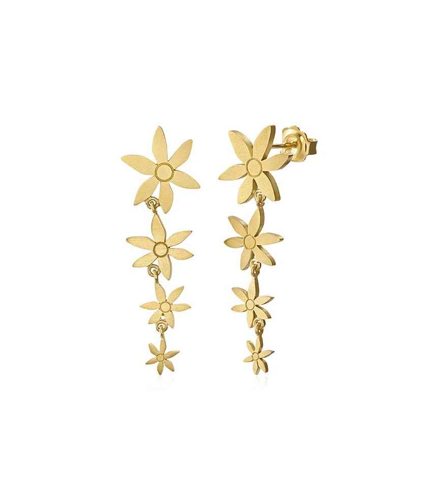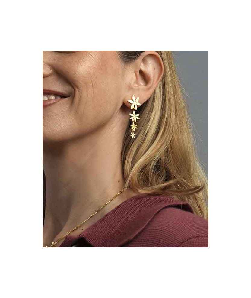 Pendientes largos con cuatro flores de distintos tamaños, elaborados en plata de 925 mm con baño de oro amarillo de 18 k y acabado mate. Ligeros, con movimiento y cierre de presión. Inspirados en la flor del azafrán, símbolo de belleza y delicadeza. Hechos a mano artesanalmente en el taller de Barcelona. Longitud: 45 mm.
