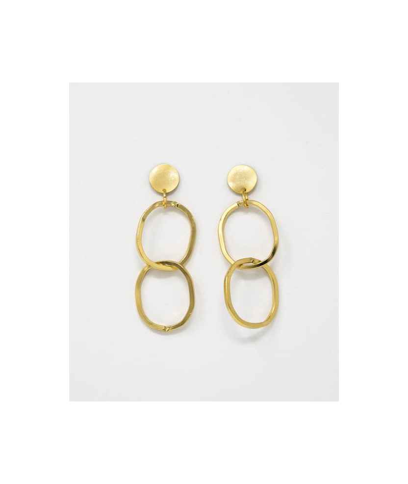 Pendientes de doble aro enlazado ligeramente alargado, elaborados en metal hipoalergénico con baño de oro y tratamiento galvánico que proporciona durabilidad. Disponibles con cierre de clip para oreja sin perforación o cierre estándar para oreja perforada. Hechos a mano. Medida: 6,5 cm.