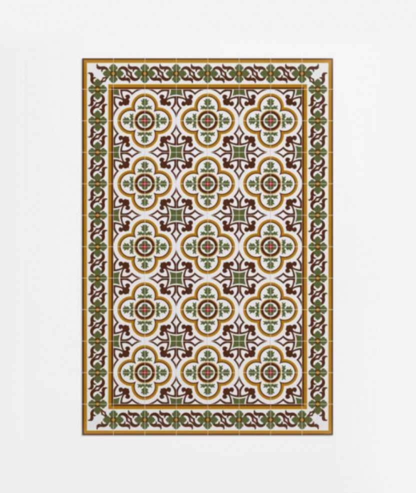 Reproduce un mosaico hidráulico de inicios del S.XX de geometrías claras, limpias y con un aire grecolatino. Una alfombra que habla de bienestar y equilibrio. De PVC, muy ligera, resitente, aislante térmica, ignífuga, antialérgica y fácil de limpiar. Disponible en varias medidas y modelos. Medidas: 120x180 cm.