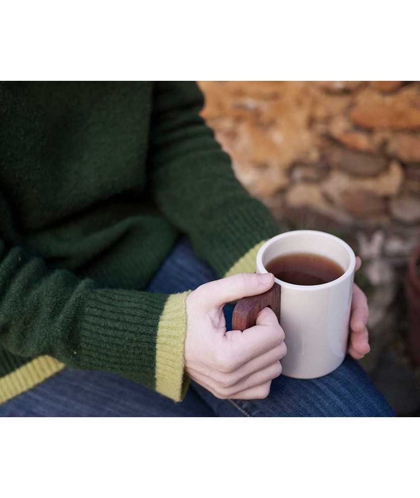 Taza de cerámica realizada artesanalmente en cerámica de porcelana esmaltada a alta temperatura. El asa es de madera de bubinga, con una extraordinaria resistencia a la humedad y los cambios de temperatura que la hacen apta para el uso alimentario. Confeccionadas íntegramente en Barcelona. Se desaconseja ponerla en el microondas y el lavavajillas a temperaturas superiores a 60C. Varios modelos y colores disponibles. Indicar el color elegido.