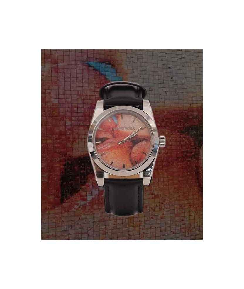 Reloj inspirado en el emblemático mural El beso, situado en el corazón de Barcelona y creado por Joan Fontcuberta. Cada pieza ha sido ensamblada a mano con gran precisión y pertenece a una edición limitada. Caja y bisel de acero inoxidable con cristal de zafiro, que aseguran resistencia y durabilidad. Movimiento a pila.