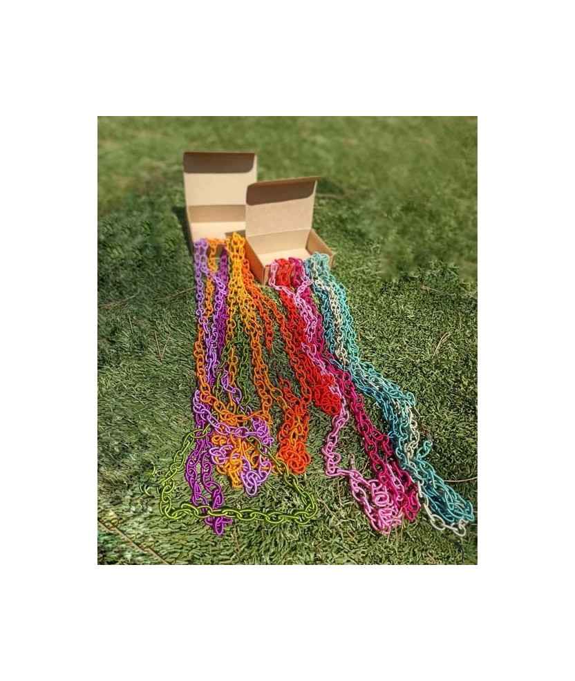 Cadena formada por pequeños eslabones de hilo de diferentes colores con cierre metálico. Una pieza ligera y versátil, ideal para dar un toque de color a cualquier estilo. Disponible en varios tonos inspirados en la paleta Pantone. Medidas: 80 cm de largo aproximadamente.
