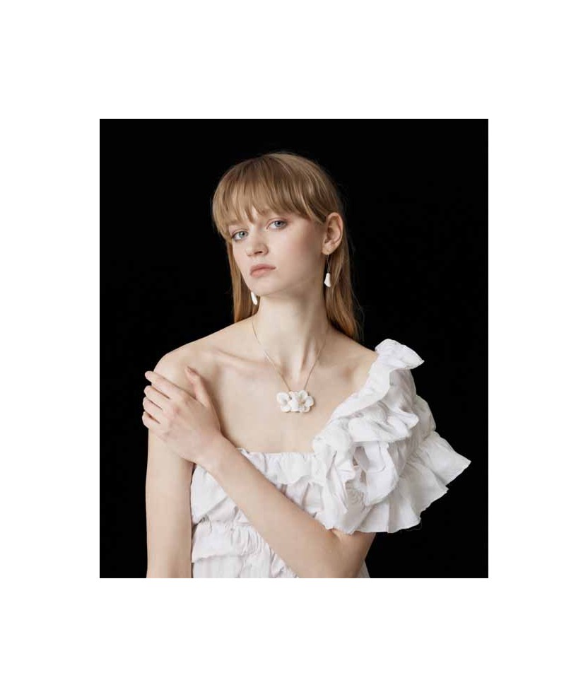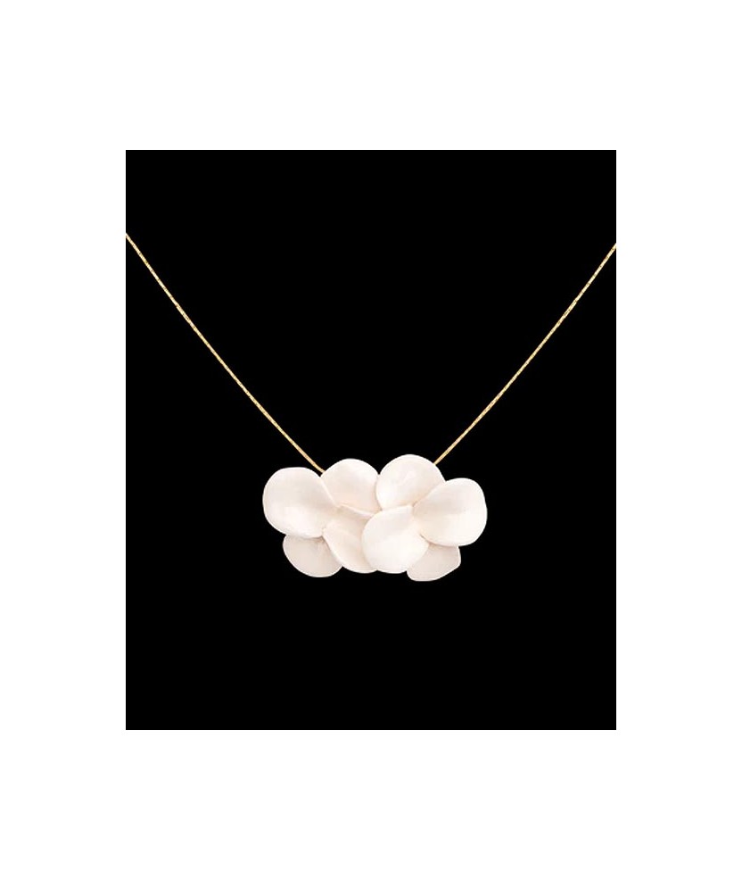 Collar compuesto por dos piezas de cerámica modeladas y esmaltadas a mano. Las formas orgánicas y el acabado artesanal resaltan la delicadeza del conjunto. La cadena es de latón chapado en oro, aportando luminosidad y equilibrio al diseño. Una pieza de carácter atemporal con contraste suave entre materiales. mides: largo de cadena 42 cm.