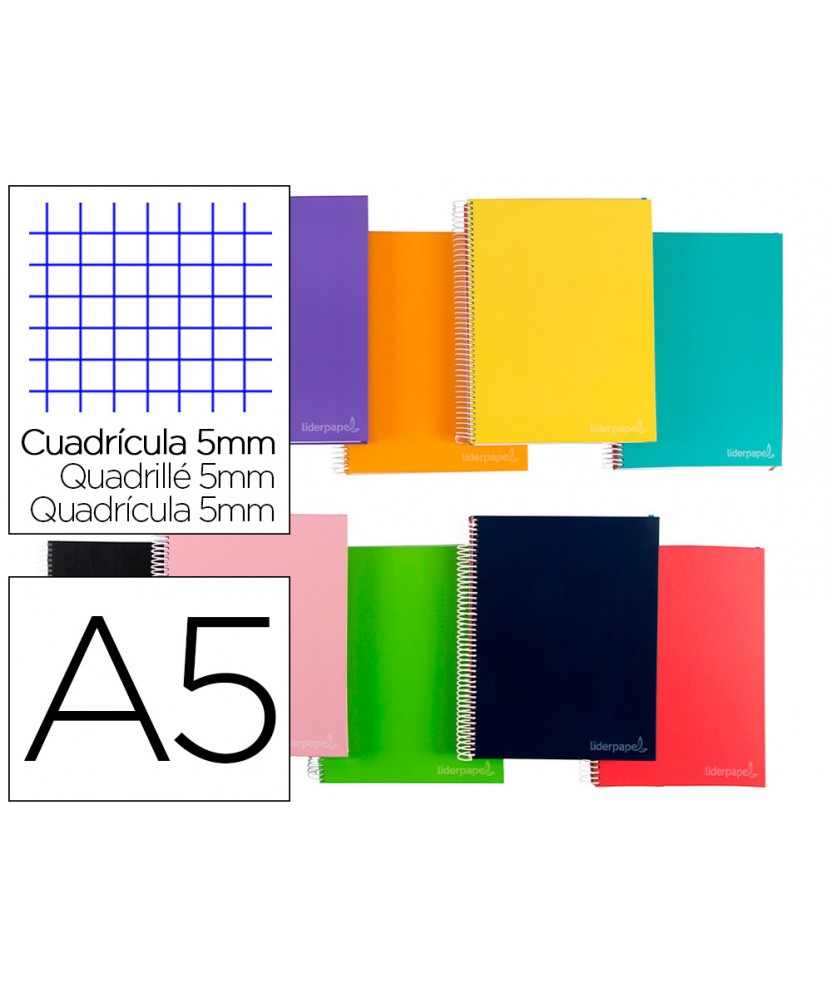 Cuaderno espiral liderpapel a5 micro jolly tapa forrada 140h 75gr cuadro 5mm 5 bandas 6 taladros colores surtidos . Tapa de cartón entrecolado de 1,5 mm de espesor, forrado con papel estucado mate de 135 g/m². Guarda interior blanca. Papel de 75 g/m ². Microperforado. 140 hojas. Bandas de 5 colores. Con cajetín. Espiral nylonizada. Coil-lock.
