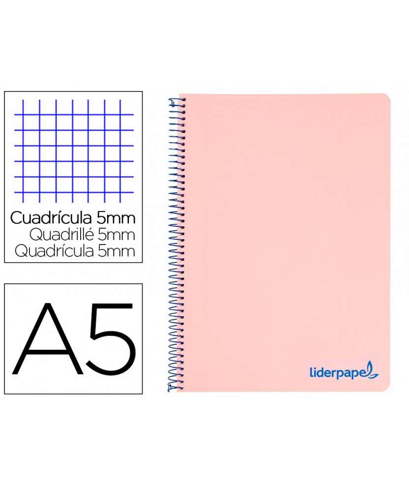 Cuaderno espiral liderpapel a5 micro wonder tapa plastico 120h 90gr cuadro 5mm 5 bandas 6 taladros color rosa . Tapa de polipropileno opaco de 600 micras impreso, que proporciona mayor duración y flexibilidad al cuaderno. Papel de 90 g/m².