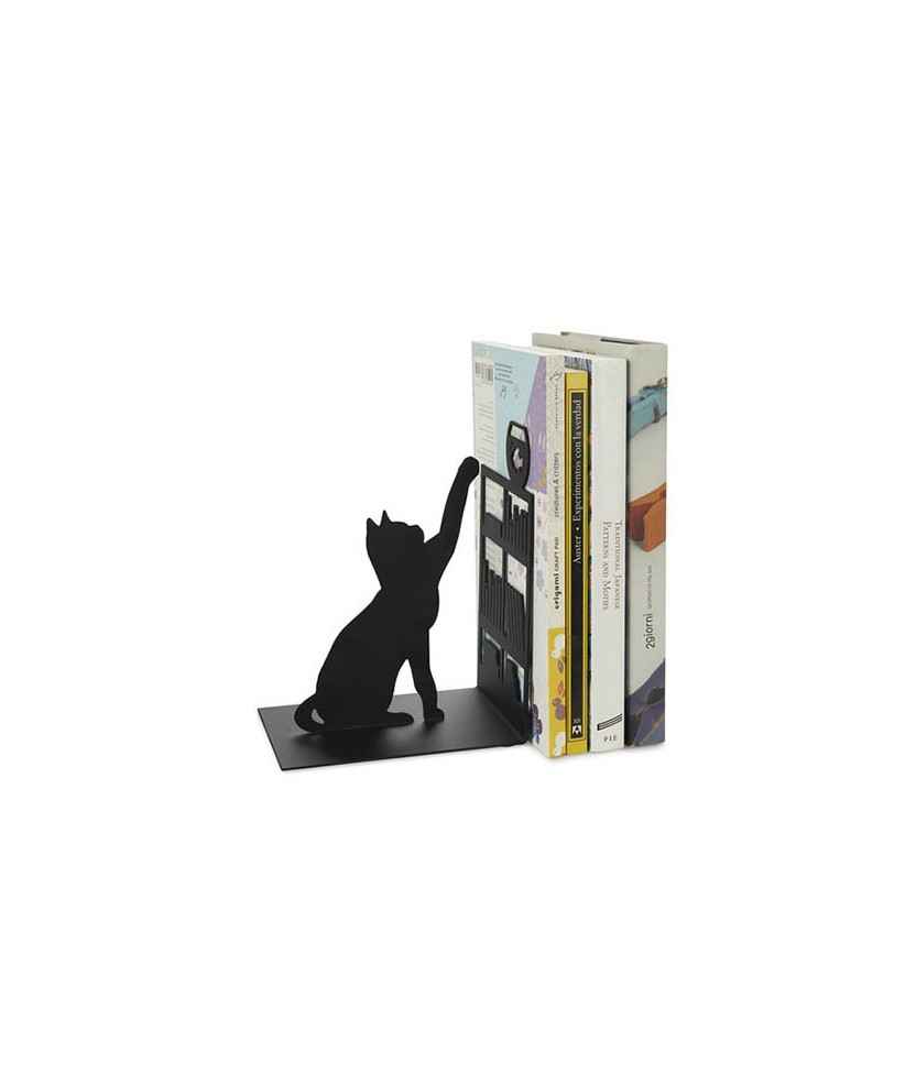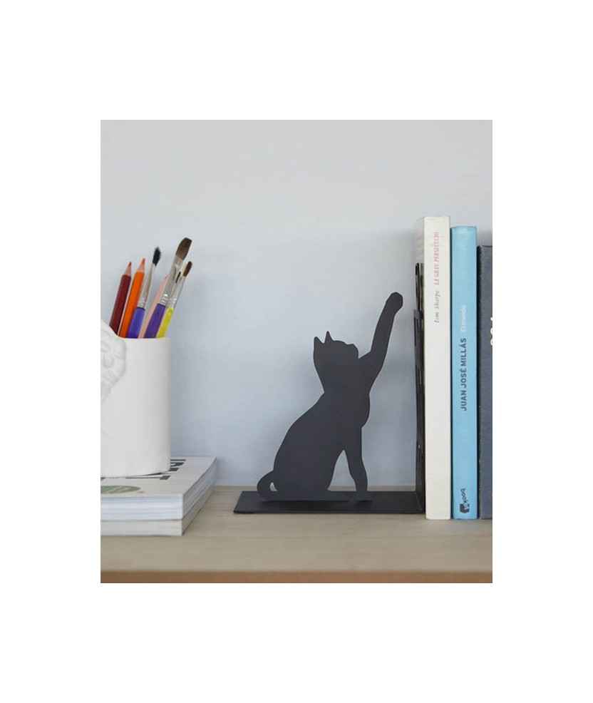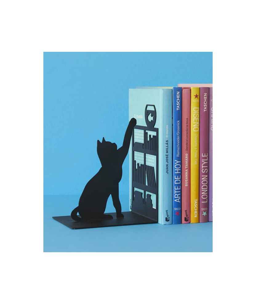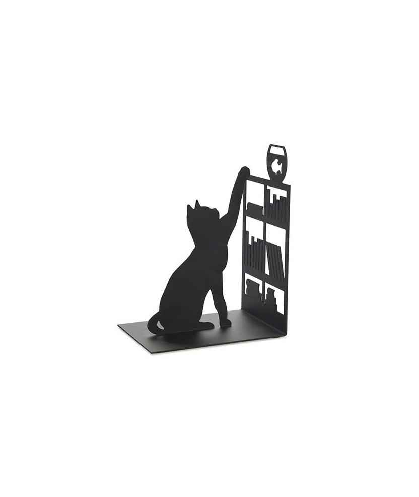Sujetalibros decorativo con la silueta de un gato que intenta tocar una pecera, situada en una librería. Gracias a su diseño, le darás un toque personal a tu librería. Fabricado en metal para mayor resistencia y durabilidad. De color negro. Medidas: 17x13x10 cm.