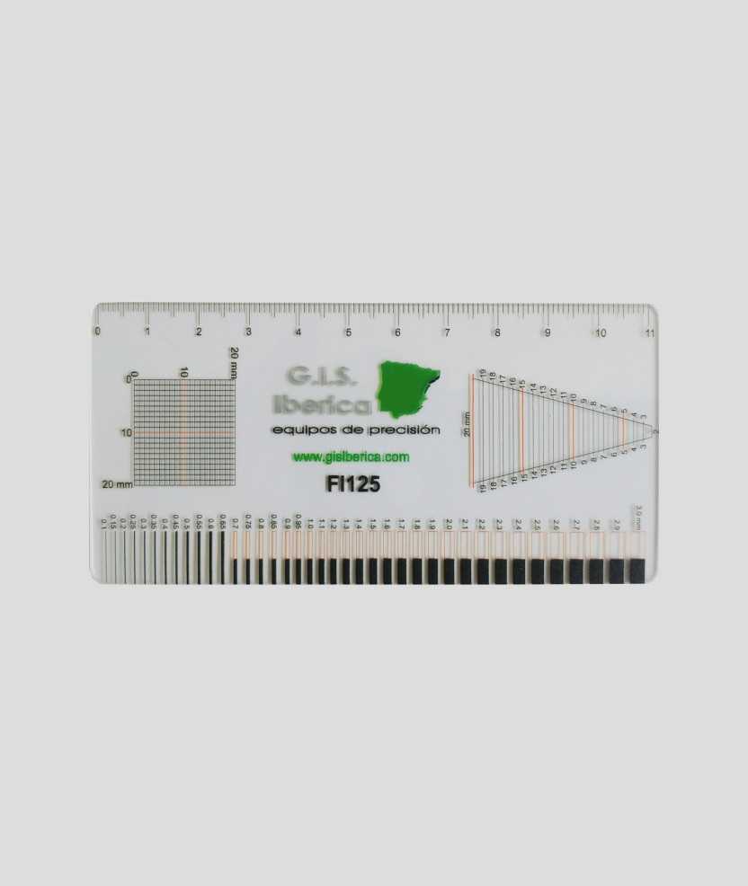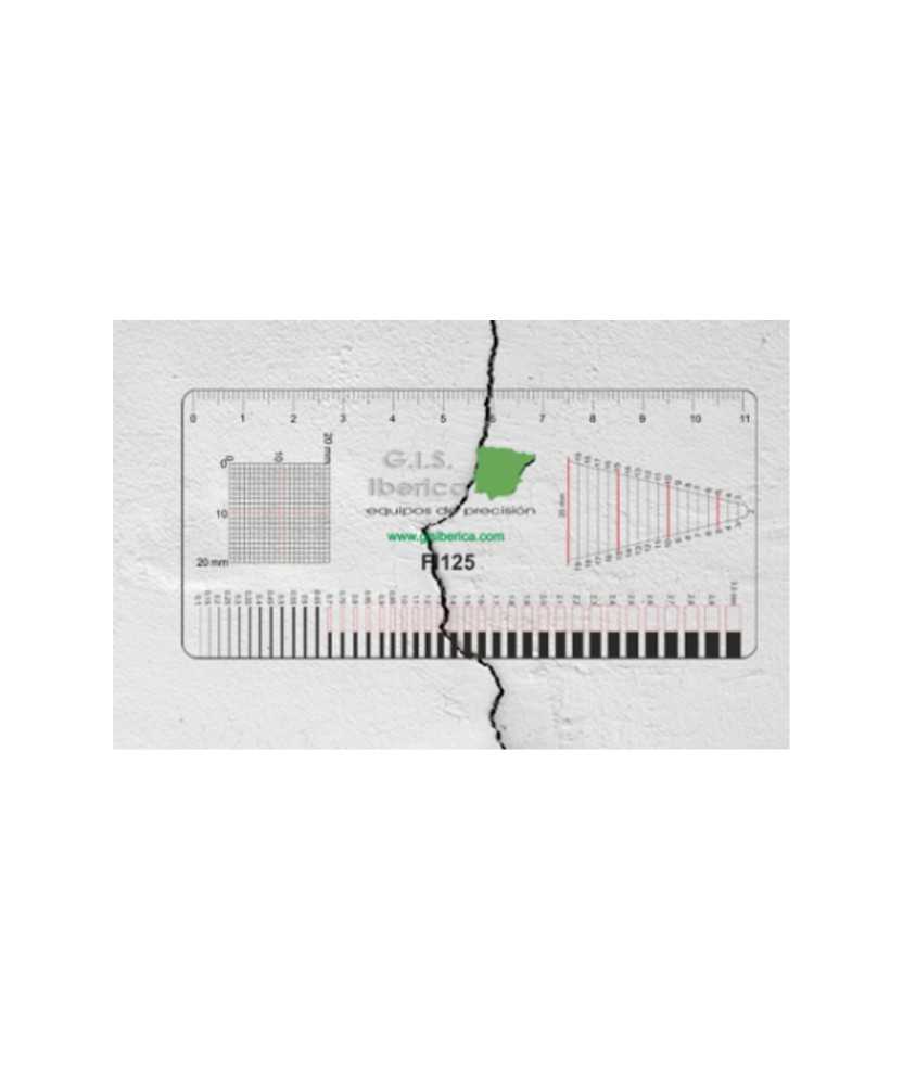 Regla transparente para medir fisuras. Fabricado con planchas de acrílico impactado Slickers. Rango de 0,1 mm. a 2,3 mm., con intervalo de 0,05 (entre 0,1 y 10 mm.), intervalo de 0,1 mm. (entre 1 mm. y 3 mm.). Con medidor central de abertura de fisuras de 2 a 20 mm. en intervalos de 1 mm. Medidas: 11,5x5,4 cm.