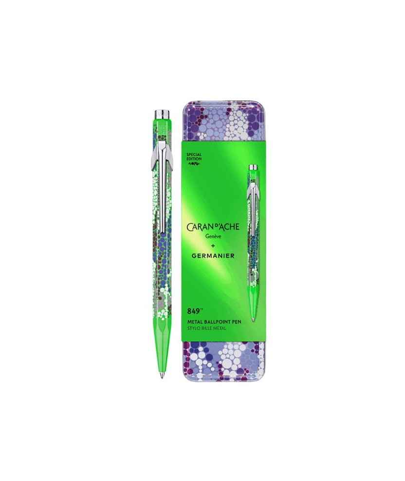 Edición especial del bolígrafo 849 diseñado junto a Kevin Germanier. Cuerpo metálico ligero verde neón con motivos inspirados en perlas decorativas y logotipo GERMANIER. Presentado en estuche holográfico reutilizable. Parte de la colección Les Fulgureuses, una celebración de creatividad y color.