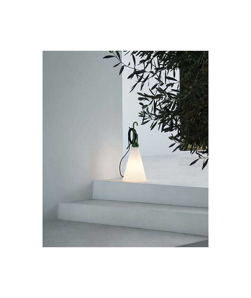Lámpara versátil para instalar en exteriores. Gancho con función de enrollador de cable y difusor cónico opalino moldeados por inyección de polipropileno sostenible obtenido a partir de residuos industriales. Interruptor de botón colocado en el asa. La fuente luminosa está protegida contra los agentes atmosféricos mediante una cápsula estanca transparente de polimetilmetacrilato sellada. Mayday puede desmontarse fácilmente para poder reciclar correctamente todas las partes. Medidas: 22x22x53 cm.