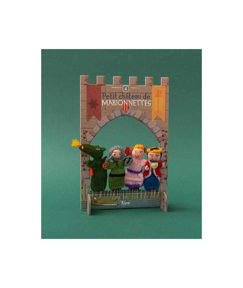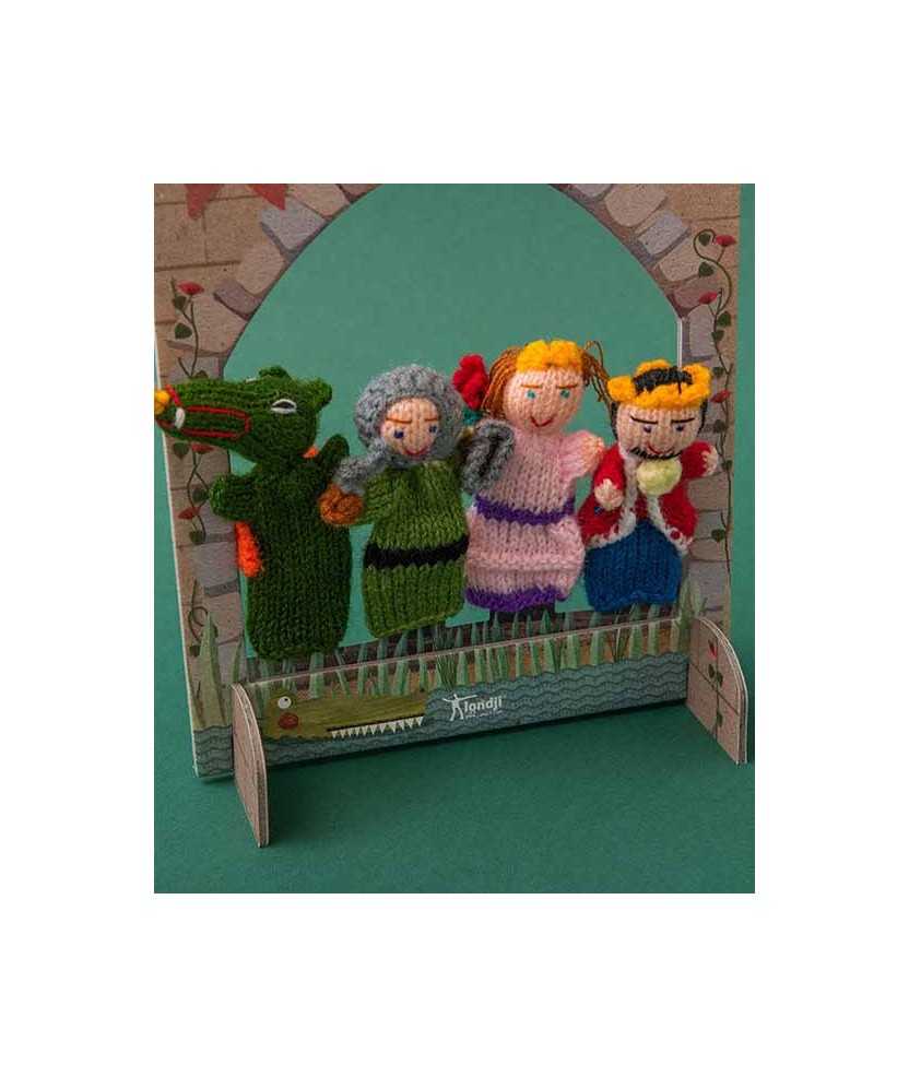Érase una vez una vez un dragón, una princesa y un caballero y que nos contarán una historia única. ¿Cómo terminará el cuento? 4 títeres de dedo de princesas y caballeros y un teatro de cartón en forma de castillo, ideal para estimular la creatividad y para inventar historias. Hecho a mano. Edad: 3+ años.