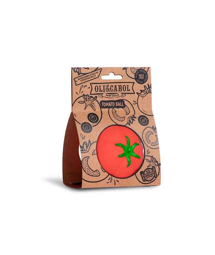 Pelota sensorial para bebé con forma de tomate, ideal para estimular el juego y el desarrollo desde temprana edad. Fabricada a mano con caucho 100% natural, sin agujeros y apta incluso para el baño. Su textura y forma irregular favorecen el agarre, el rebote suave y el estímulo sensorial. Ecológica, segura y libre de tóxicos: también funciona como mordedor para calmar las encías.