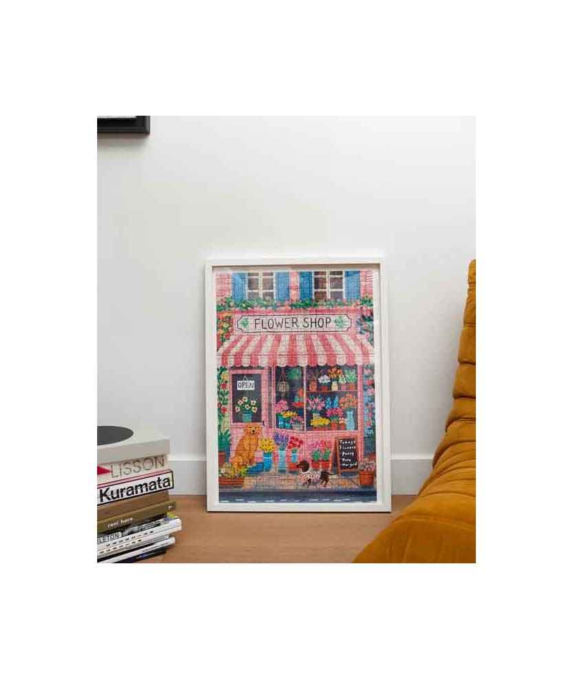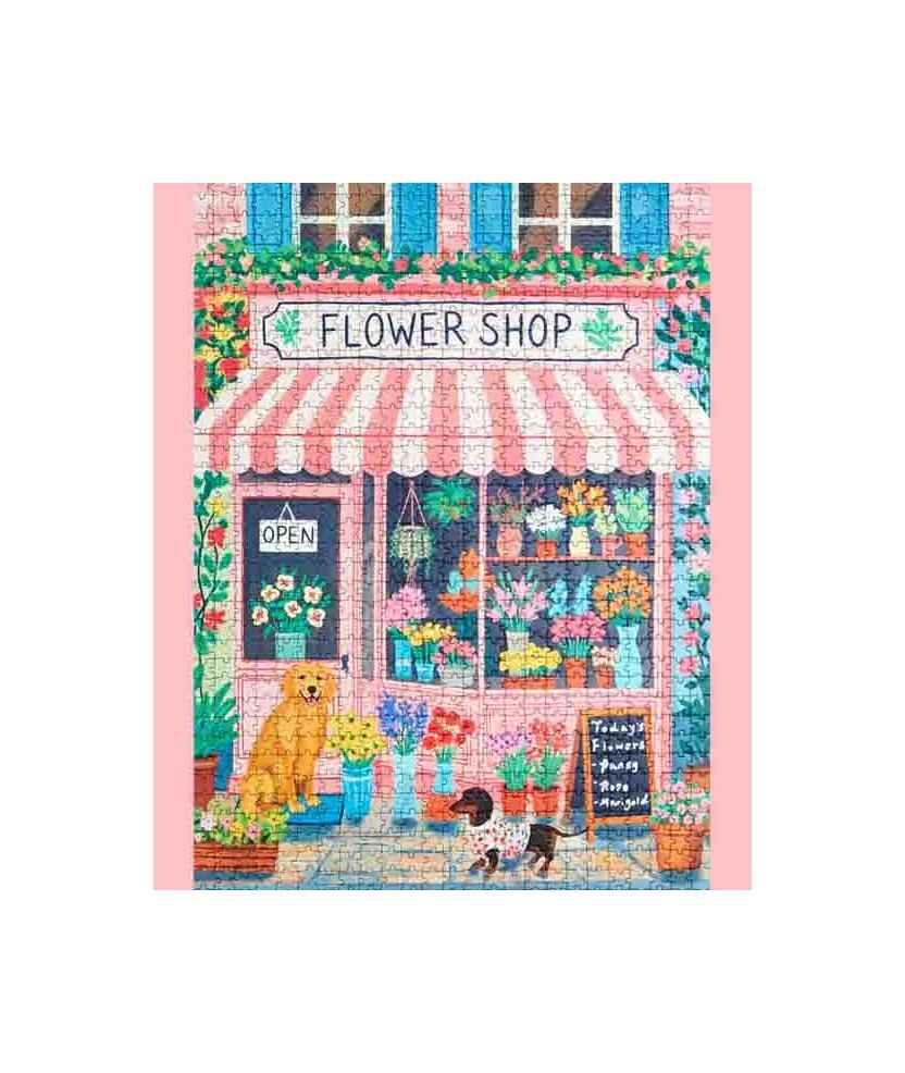 Puzzle de 1000 piezas con ilustración de Yuna Moona que muestra perros en una floristería colorida. Fabricado en España con cartón de calidad. Caja compacta ideal para guardar o regalar. Dificultad media, mayores de 14 años. Material: cartón. Medidas: 66x45x0,17 cm.
