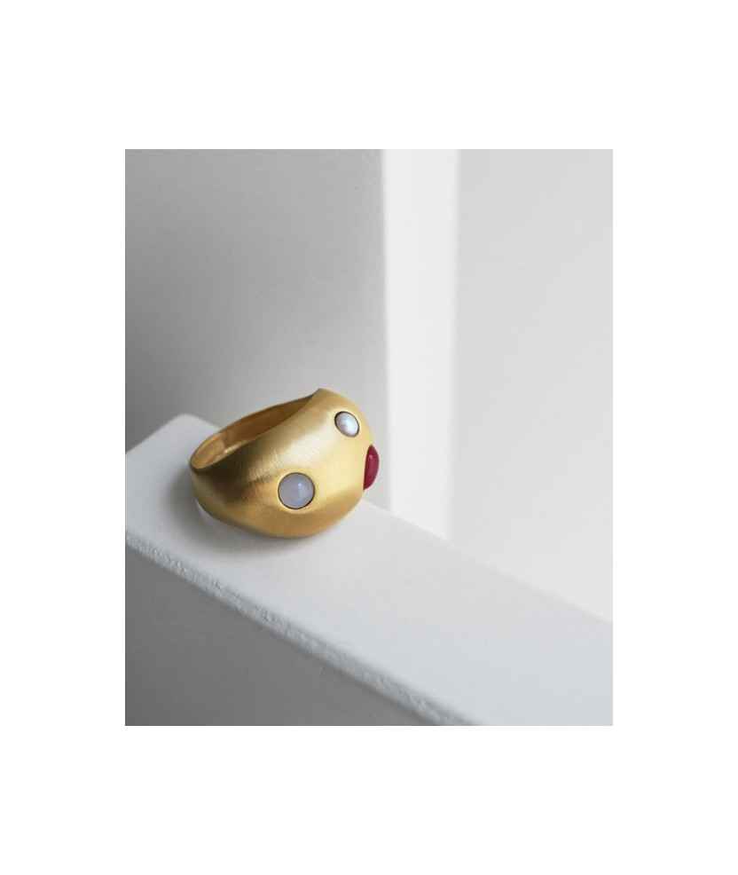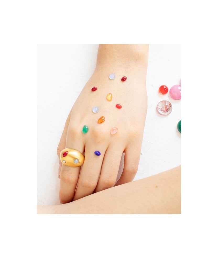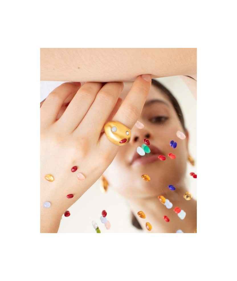 Anillo dorado de forma redondeada con incrustaciones de cristales de Murano en tonalidades malvas y perlas de resina de alta durabilidad. Una pieza que evoca fragmentos de sueños marinos de la costa menorquina. Fabricado en metal mate con baño de oro de 24 K.
