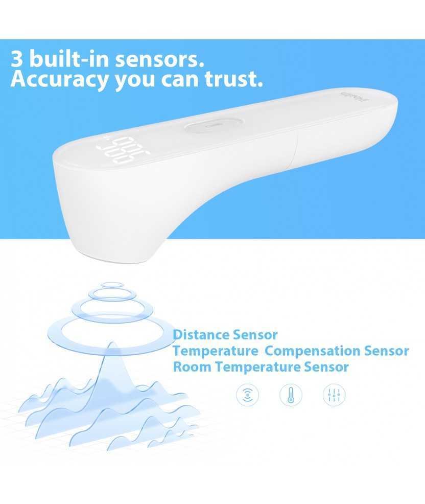 Termómetro infrarrojo sin contacto que permite conocer la temperatura corporal de una persona en segundos. El sensor de infrarrojos ultra-sensible mide la energía IR emitida desde el frente y recopila más de 100 puntos de datos aportando una alta precisión en sólo un segundo. También incorpora un sensor de distancia para evitar medidas inválidas. Su diseño sin contacto permite medir con seguridad e higiene. Lectura retroiluminda con una vibración suave cuando la finaliza.