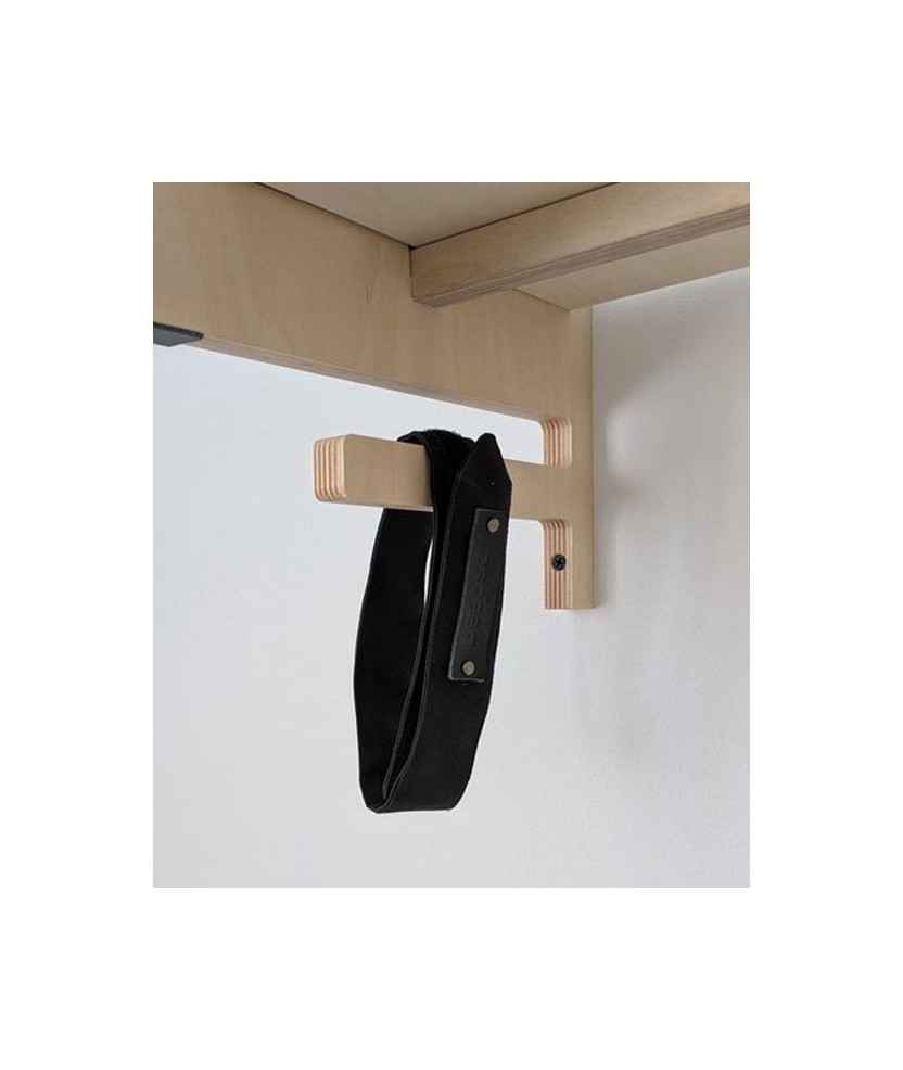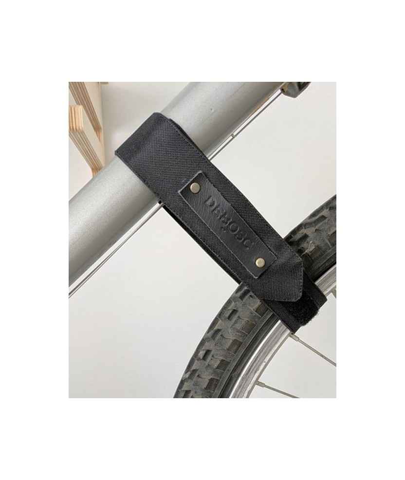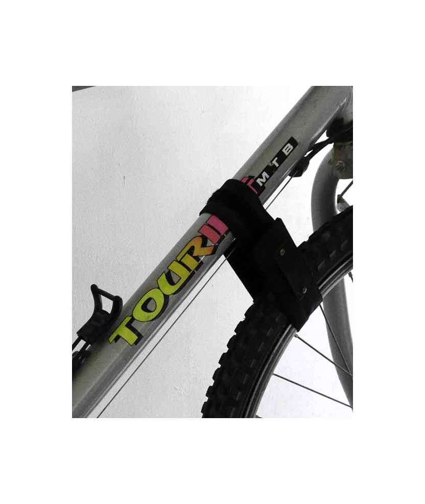 El Mallot es una correa que evita que la rueda delantera de la bici gire y ensucie la pared cuando está colgada. Está hecha de tela impermeable y se fija con velcro en el tubo diagonal del cuadro. Inmoviliza tanto la rueda como el manillar de forma sencilla y eficaz. Viene incluida con el soporte La Volta, pero también se puede comprar por separado. Diseñado en Anglès. Medidas: 3,5x54 cm.