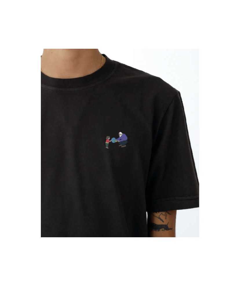 Esta camiseta negra de IAIOS presenta un diseño minimalista con un dibujo lineal de un anciano entregando el planeta Tierra a una niña, una imagen simbólica sobre el legado, el cuidado del planeta y la esperanza en el futuro. Su tejido suave y resistente la hace perfecta para el día a día. Una opción sostenible, confeccionada en Portugal con algodón orgánico certificado por GOTS. Material: 100% algodón orgánico.