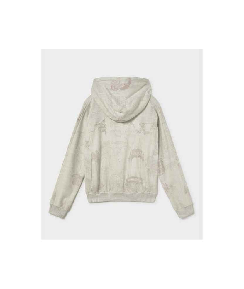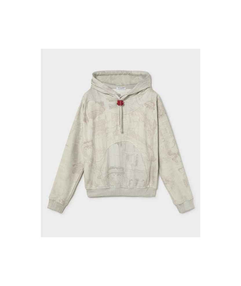 Sudadera oversize de algodón con patrón de costuras curvas y mangas japonesas. Presenta un estampado integral de bocetos de la arquitectura modernista de Barcelona y el nuevo botón de la colección en la espalda. 100% algodón grueso. Disponible en tallas S-XL. Diseñado y hecho en Barcelona por Ugo Boulard dentro del programa Barcelona Fashion Forward 2025.