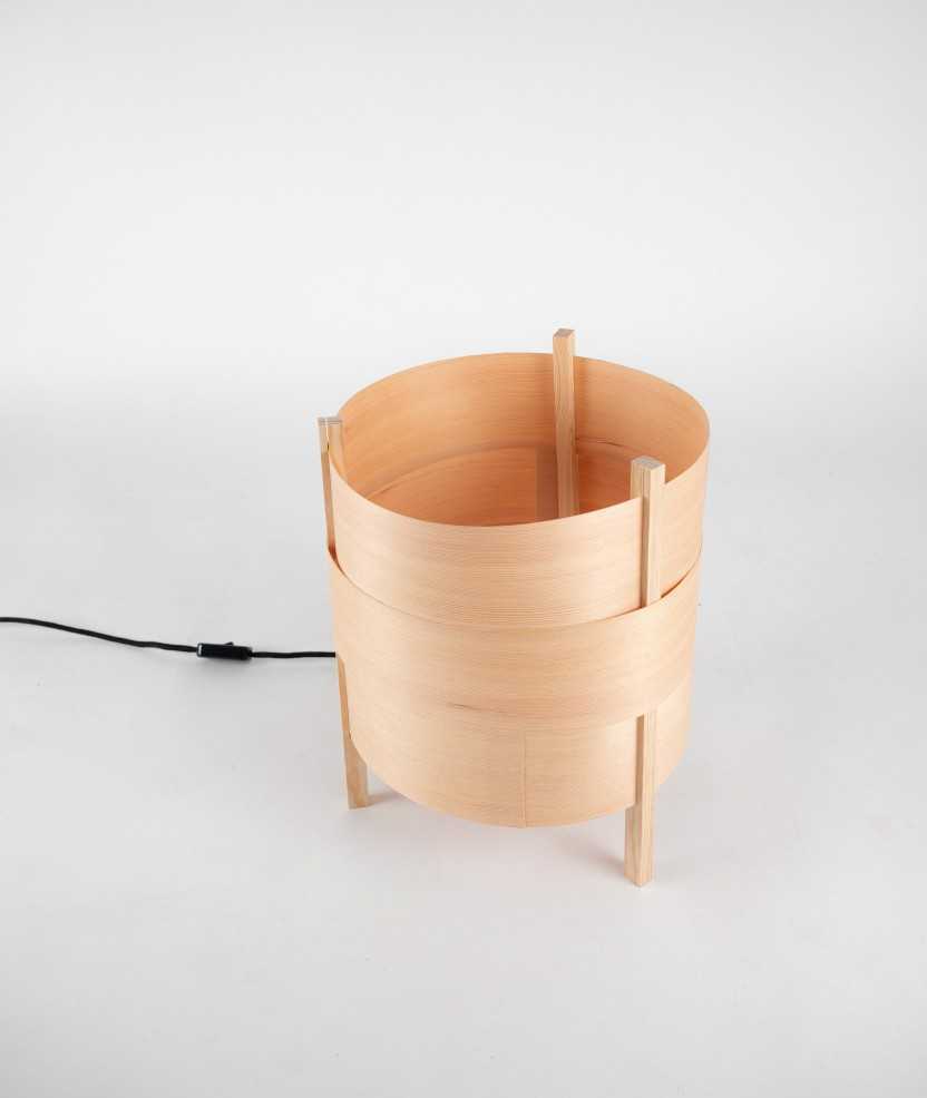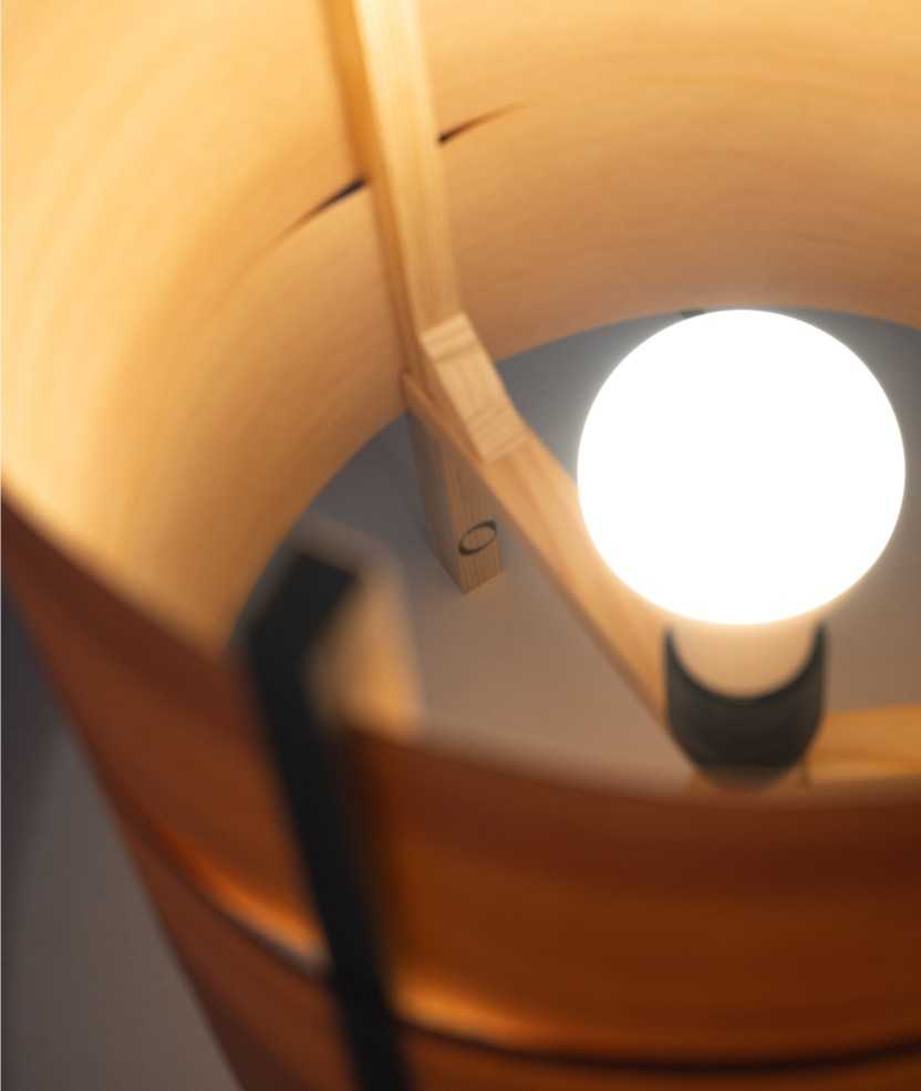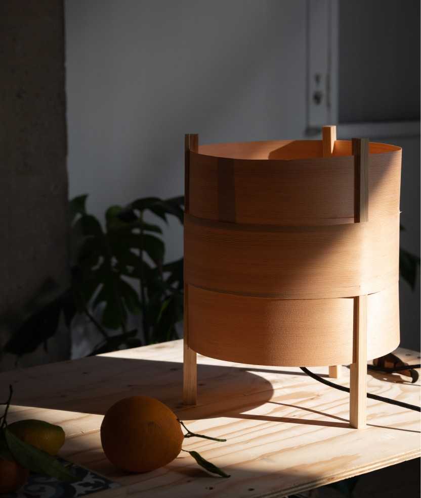 La lámpara Concéntrica está hecha con pino de Oregon (Pseudotsuga menziesii), una especie de conífera de follaje persistente nativa de América del Norte, pero extendida también en Europa y América del Sur. Compuesta por tres láminas curvas concéntricas que arropan la bombilla, cuando pasa la luz, la madera adopta un tono calabaza cálido y se acentúan las vetas. Diseñada y producida artesanalmente en Barcelona. Medidas: 31 x 40 cm.